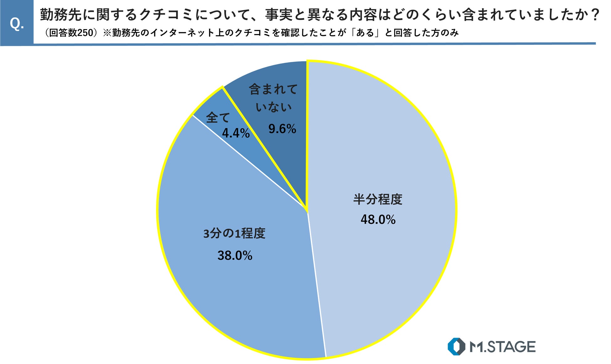 クチコミに含まれる事実と異なる内容の程度について、「半分程度」含まれていたという回答が最も多く48.0%となりました。次に「3分の1程度」(38.0%)が続き、「全て」という回答は4.4%となりました。約9割の医師の勤務先のクチコミに、事実と異なる内容が含まれていたという結果になりました。