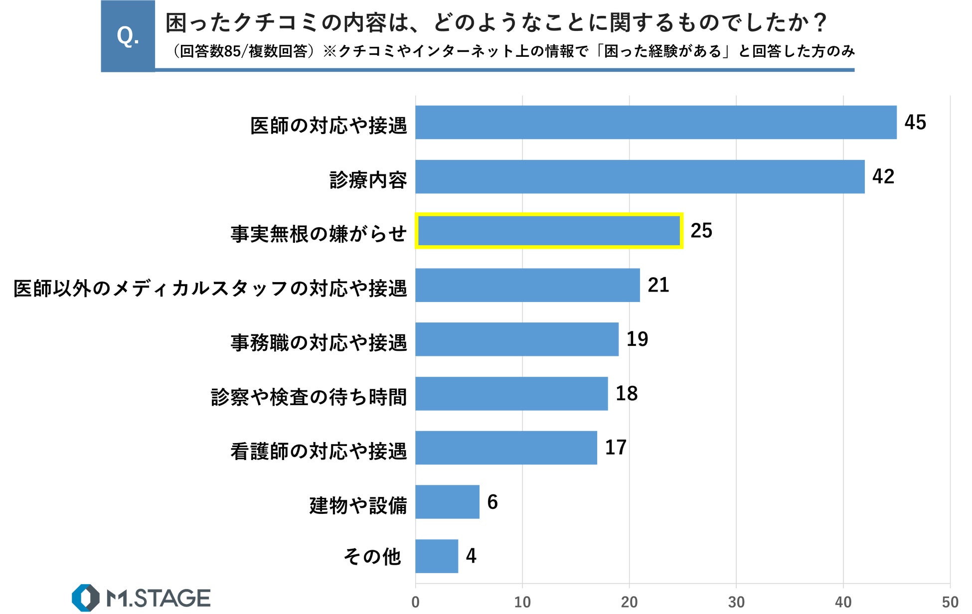困ったクチコミの内容では、「医師の対応や接遇」(45)に関するものが最も多く、次いで「診療内容」(42)、「事実無根の嫌がらせ」(25)が続く結果となりました。