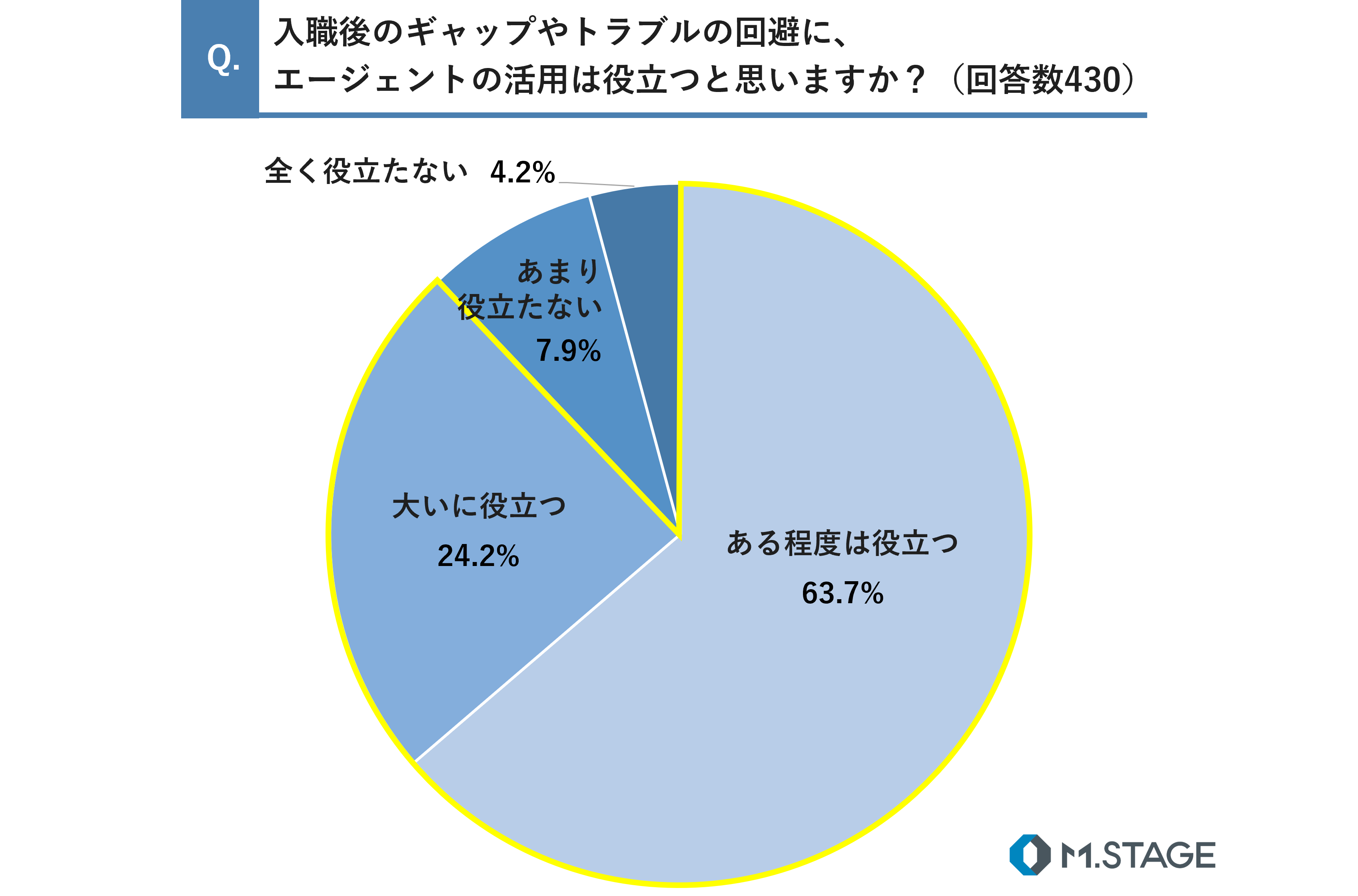 入社後のギャップやトラブルを回避するためにエージェントを活用することについて、「ある程度は役立つ」と回答した医師は63.7%、「大いに役立つ」と回答した医師は24.2%となり、87.9%の医師が入職後のギャップ回避にエージェントの活用が役立つと感じている結果となりました。