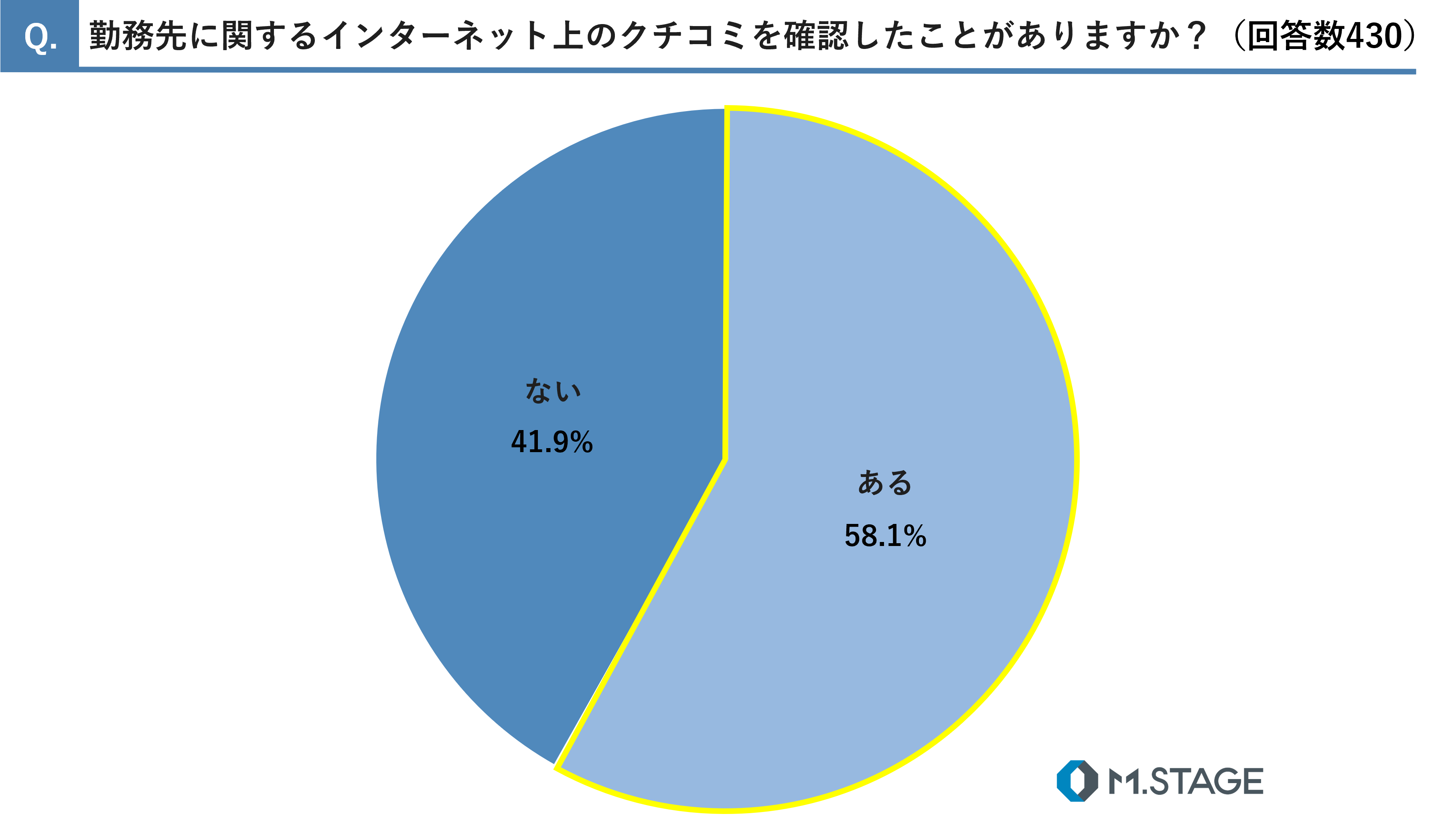 勤務先に関するインターネット上のクチコミ(患者からのクチコミ)について、確認したことが「ある」と回答した医師は58.1%となり、半数以上が勤務先のクチコミを確認したことがある結果となりました。
