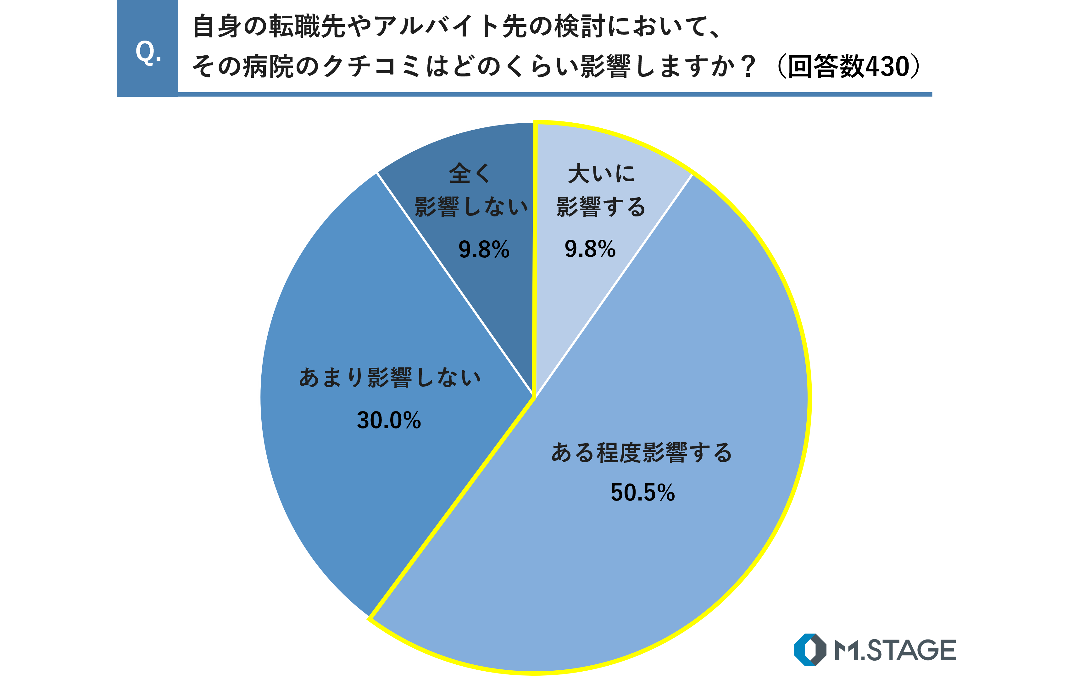 転職先やアルバイト先を検討する際のインターネット上のクチコミ(患者からのクチコミ・転職サイト等の従業員のクチコミ)の影響度合いについて、「大いに影響する」と回答した医師は9.8%、「ある程度影響する」と回答した医師は50.5%となり、約6割が転職先やアルバイト先の検討において、クチコミが影響する結果となりました。