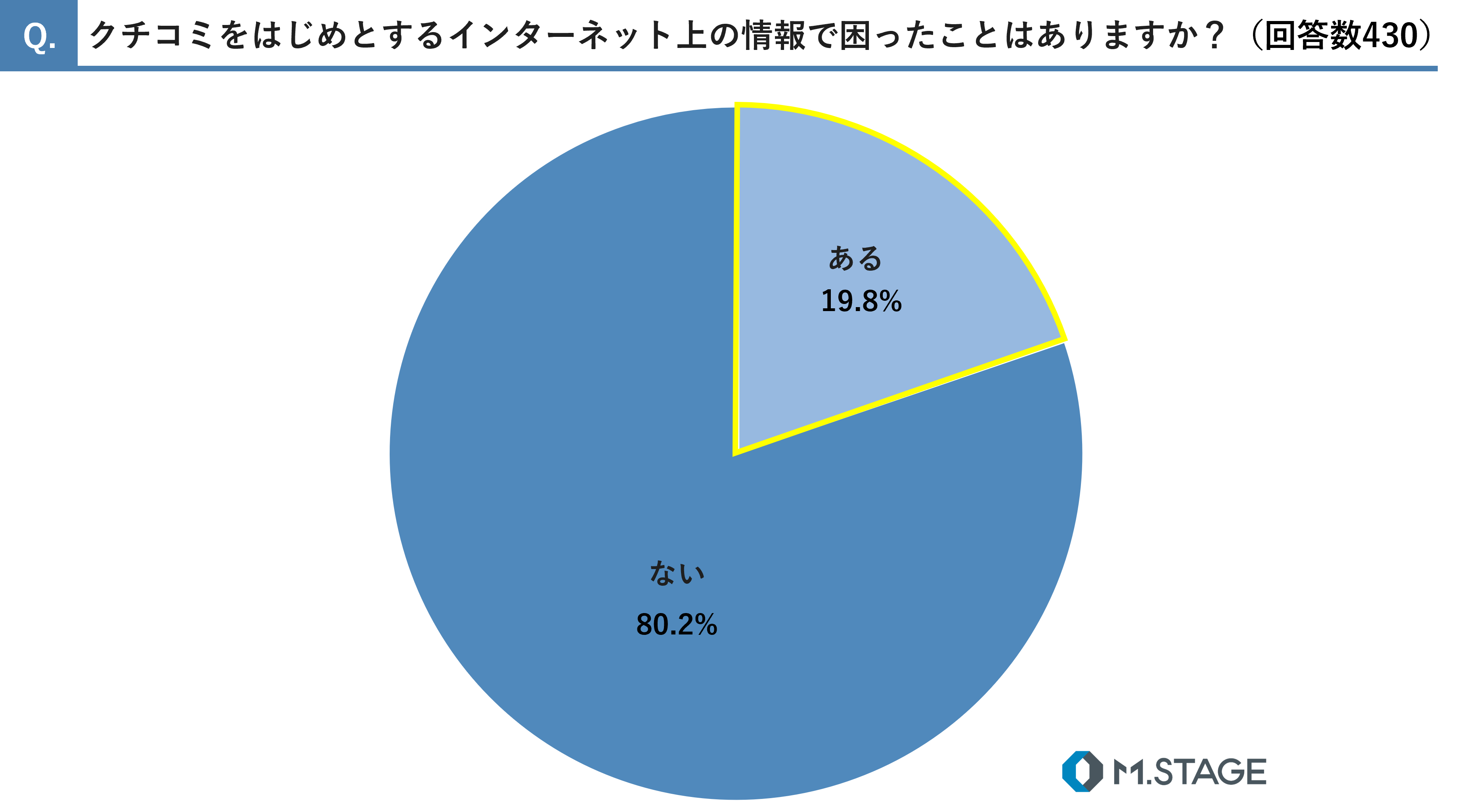 クチコミをはじめとするインターネット上の情報で困った経験が「ある」と回答した医師は19.8%となり、5人に1人の医師はインターネット上の情報によって困った経験がある結果となりました。