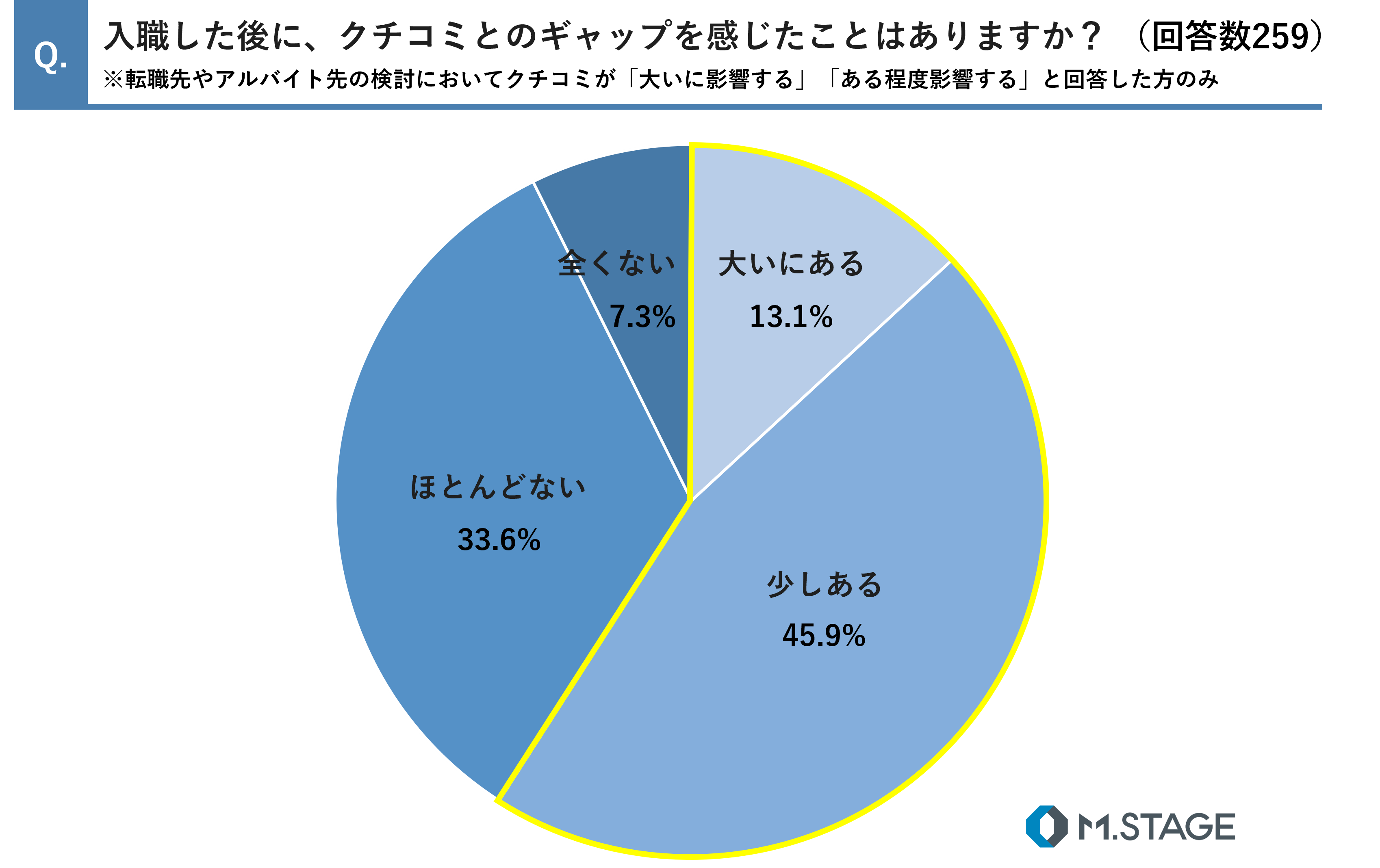 転職先やアルバイト先の検討にクチコミが影響すると回答した医師において、入職後にクチコミとのギャップを感じたことが「大いにある」と回答した医師は13.1%、「少しある」と回答した医師は45.9%となり、半数以上が入社後にクチコミとのギャップを感じたことがある結果となりました。