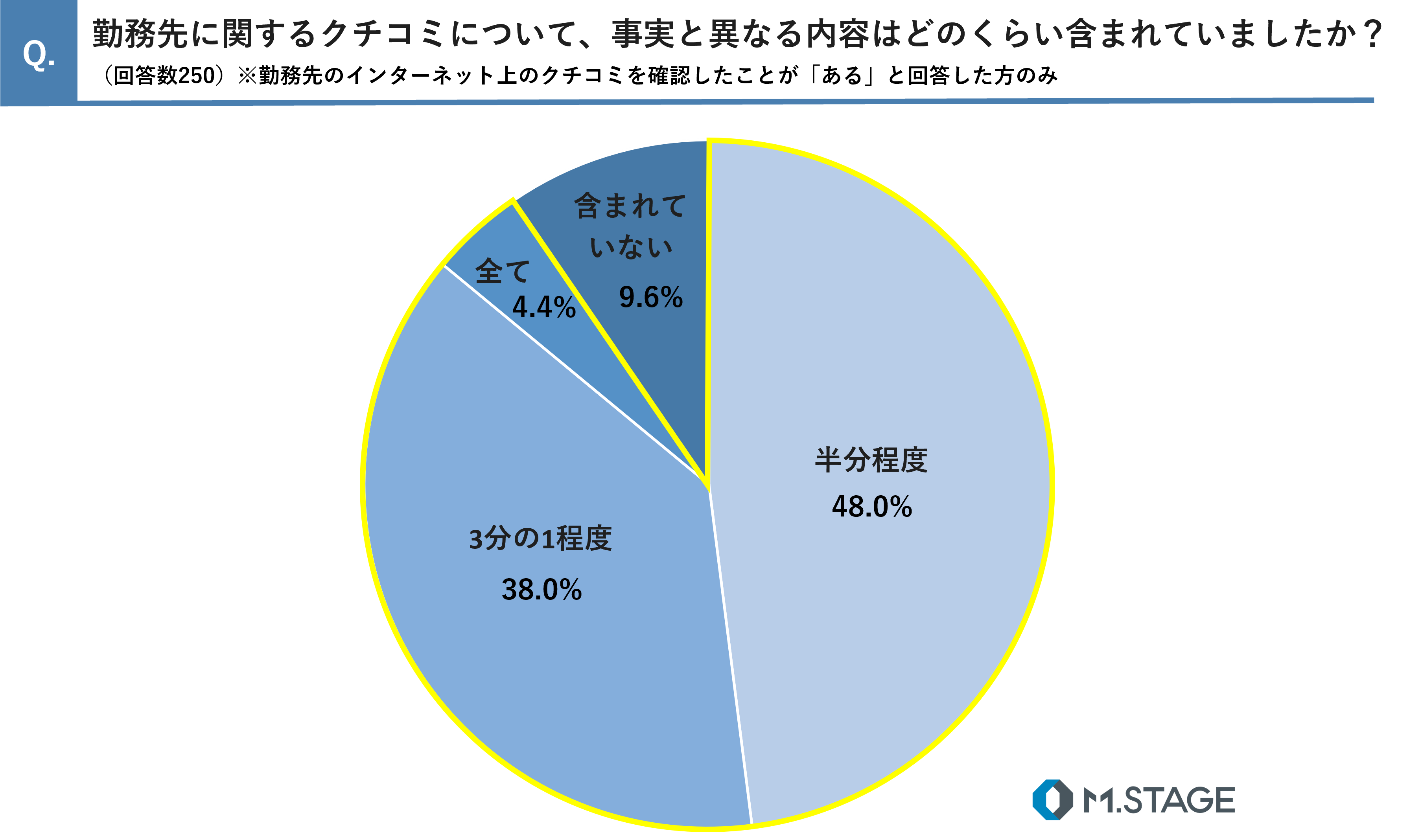 クチコミに含まれる事実と異なる内容の程度について、「半分程度」含まれていたという回答が最も多く48.0%となりました。次に「3分の1程度」(38.0%)が続き、「全て」という回答は4.4%となりました。約9割の医師の勤務先のクチコミに、事実と異なる内容が含まれていたという結果になりました。