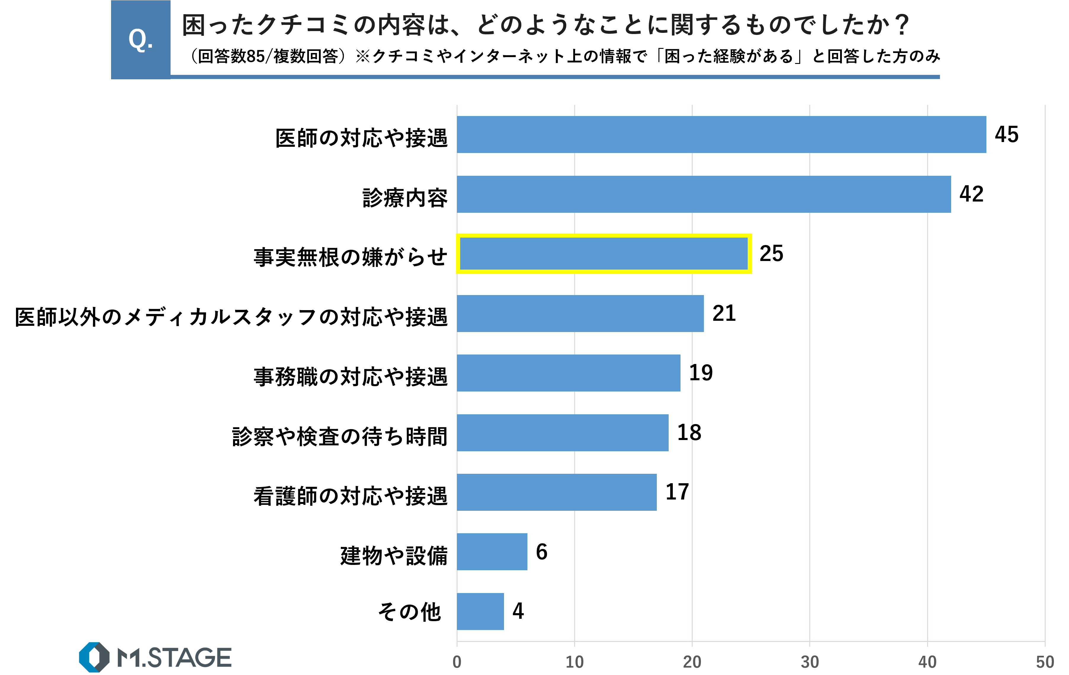 困ったクチコミの内容では、「医師の対応や接遇」(45)に関するものが最も多く、次いで「診療内容」(42)、「事実無根の嫌がらせ」(25)が続く結果となりました。