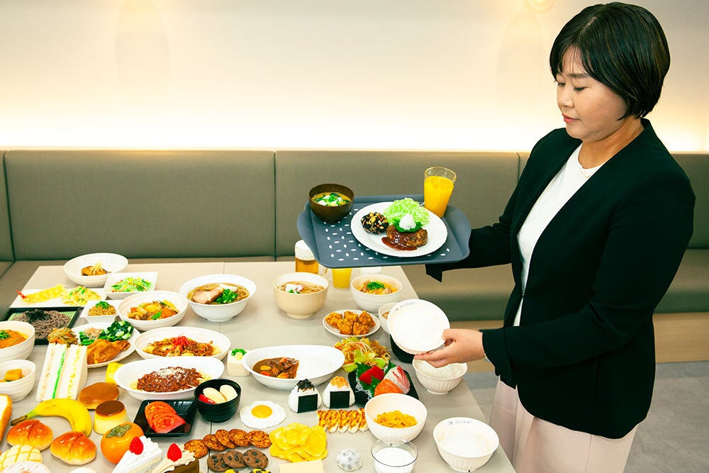 朝食、昼食、夕食、間食の普段食べているものに近いメニューをビュッフェ形式で選び、トレーに乗せます。