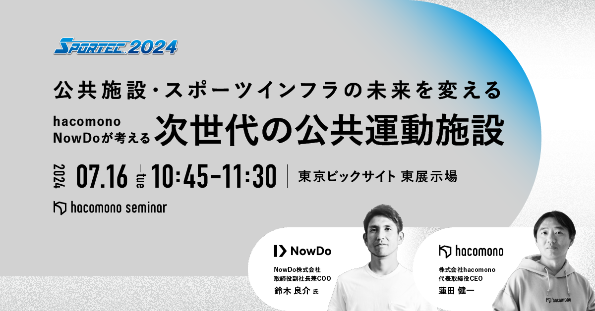 日本の公共運動施設とスポーツインフラは現在、進まないデジタル化、キャッシュレス化、スマート化といった課題に直面しています。使い勝手の悪い施設がどのようにして現代のニーズに応える形に変貌できるのか、その可能性を探ります。このセミナーでは、本田圭佑氏が立ち上げたNowDo社ファウンダーである取締役副社長兼COOの 鈴木良介氏とhacomono CEO 蓮田が登壇し、スポーツ環境と文化における革新的な改善策を提案します。公共施設の運営者、政策立案者、スポーツ愛好者が一堂に会し、情報共有と意見交換の場を設けることで、現在のスポーツが抱えるイメージや参加障壁をどう乗り越えるのか、よりアクセスしやすく魅力的な公共スポーツ施設を実現するための具体的な方策を議論します。最終的には、より多くの人々がスポーツを楽しめる環境づくりを目指します。