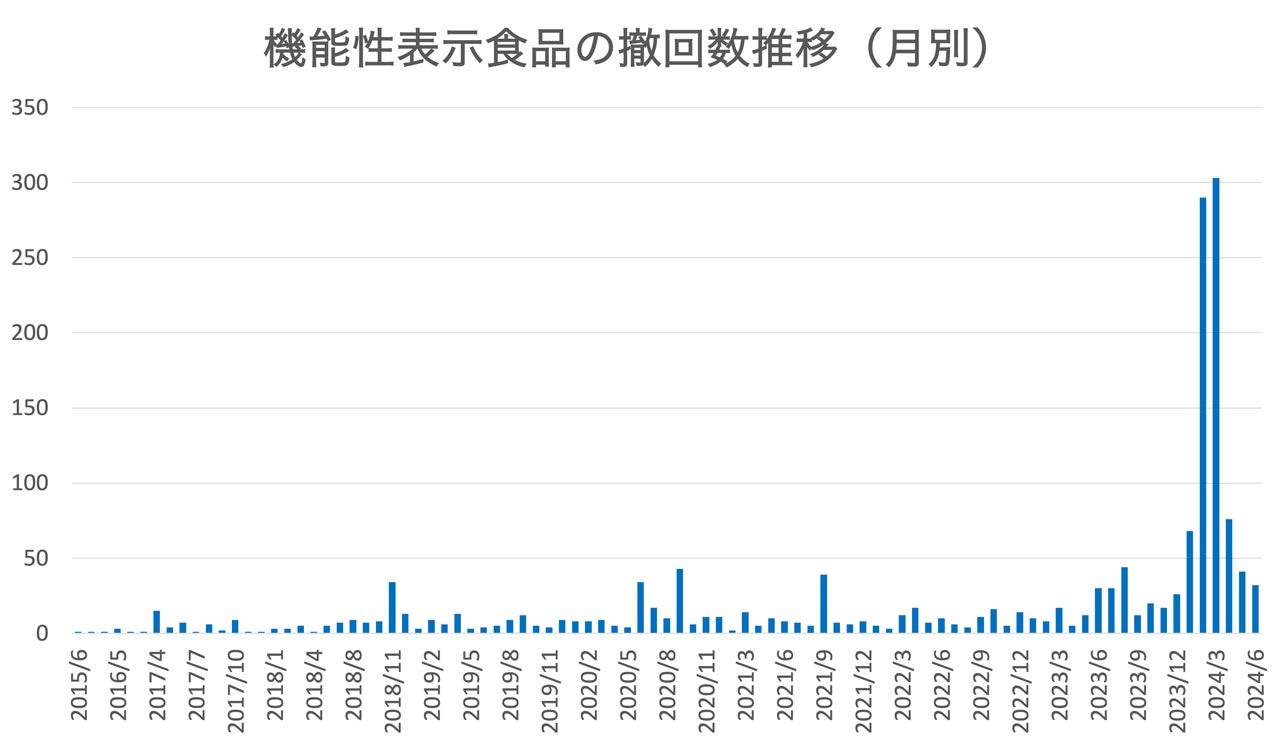機能性表示食品の撤回数は2023年度に大きく増えました。科学的根拠についてチェックが入ったり、商品の販売が終了したりしたことが要因です。グラフでも突出した数字になっています。