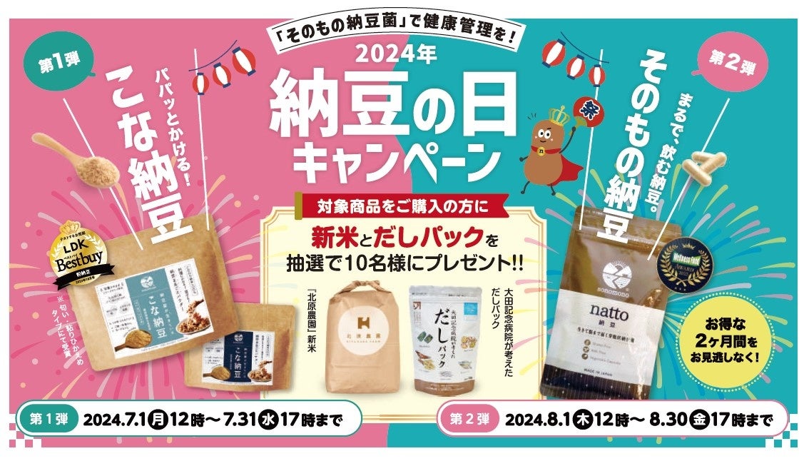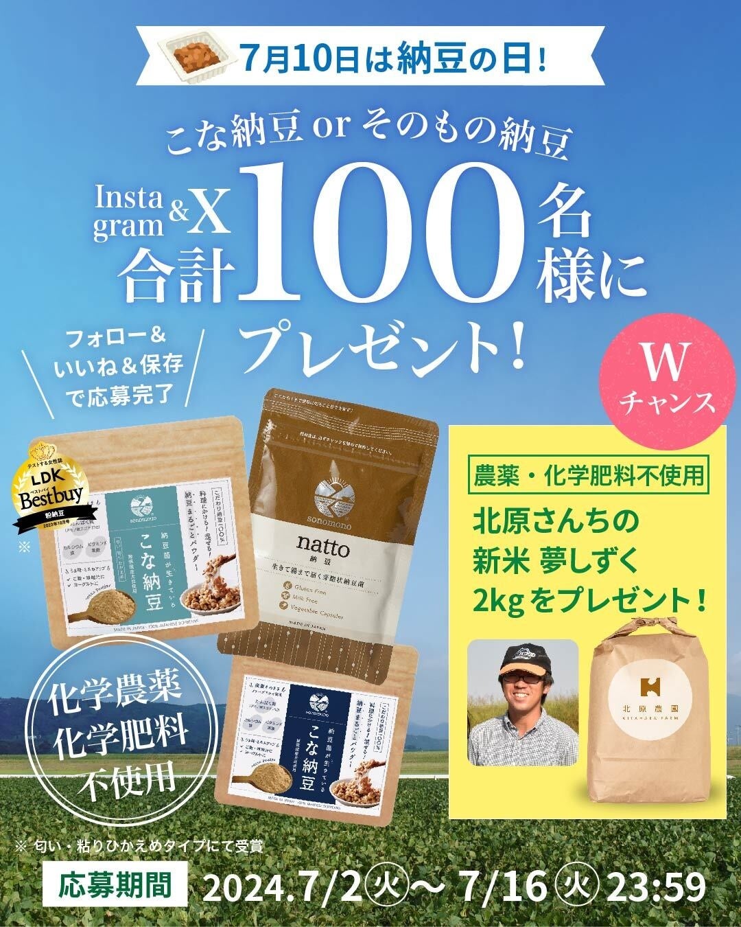 そのもの株式会社(英語表記sonomono Inc. 本社:福岡市、代表:日高絵美)は、7月10日「納豆の日」を記念して、今年の猛暑も納豆菌パワーで元気に乗り切って欲しいという想いを込めて、年に一度の「納豆の日スペシャルキャンペーン」を開催。また、公式Instagram、公式Xで、プレゼント企画も同時開催します。