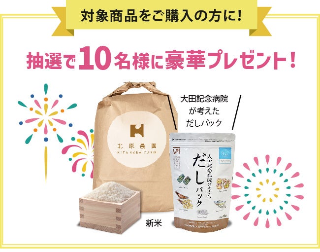 期間中、キャンペーン対象商品をご購入の方の中から抽選で、そのもの納豆菌シリーズの原料となる大豆の生産農家、佐賀県江北町有機研究会の北原さんが作る「おいしい新米」と、スタッフが実際に使って「これはおいしい!」と太鼓判の「大田記念病院が考えただしパック」をセットでプレゼントさせていただきます。
