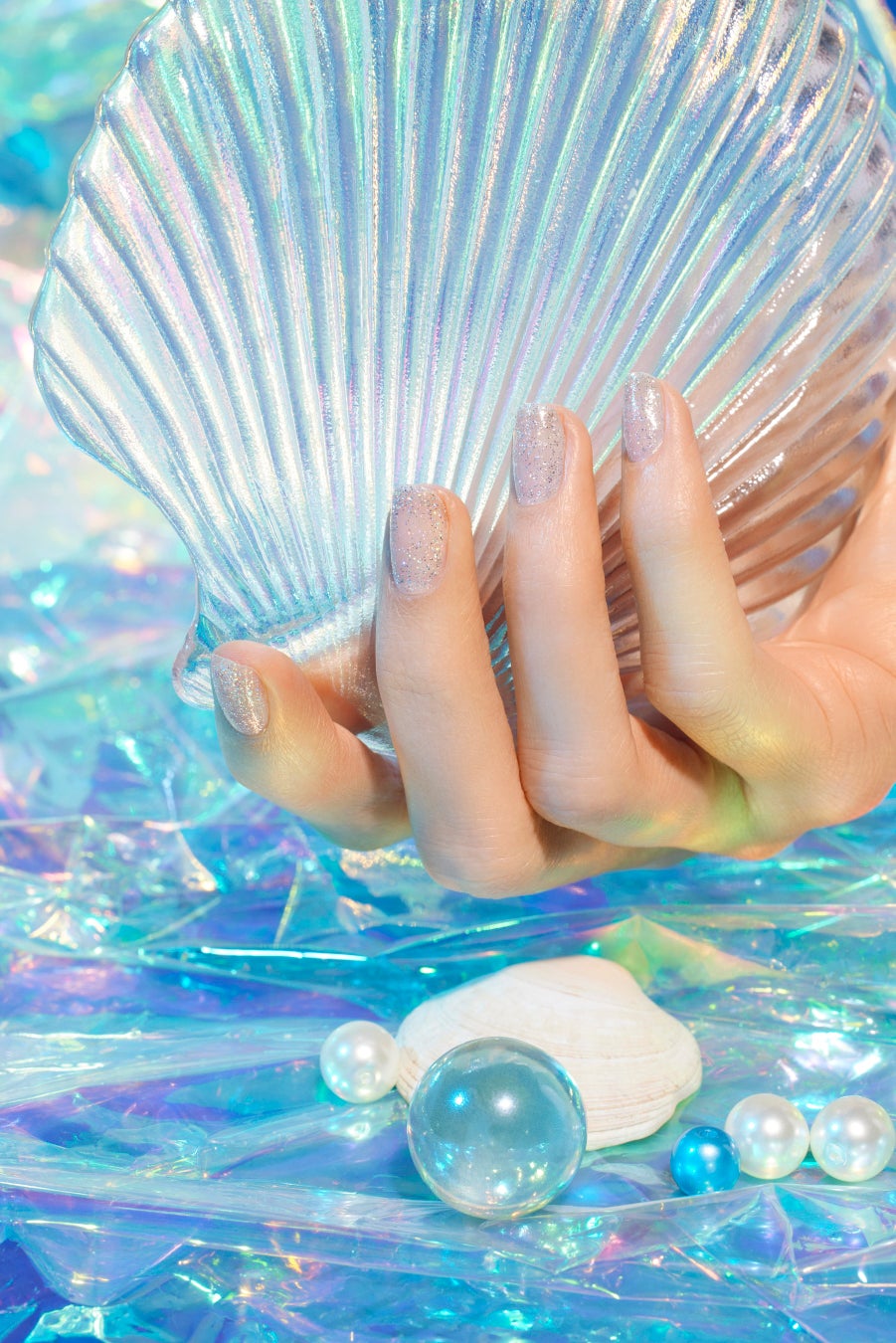 これはかつて童話の人魚がまとっていた美しい鱗のかけらでしょうか。渚に踊る幾千もの煌めきのように、色とりどりに光るラメが指先に夏を連れてきます。上品なクリアカラーはナチュラルでも、重ねづけを楽しんでも。
