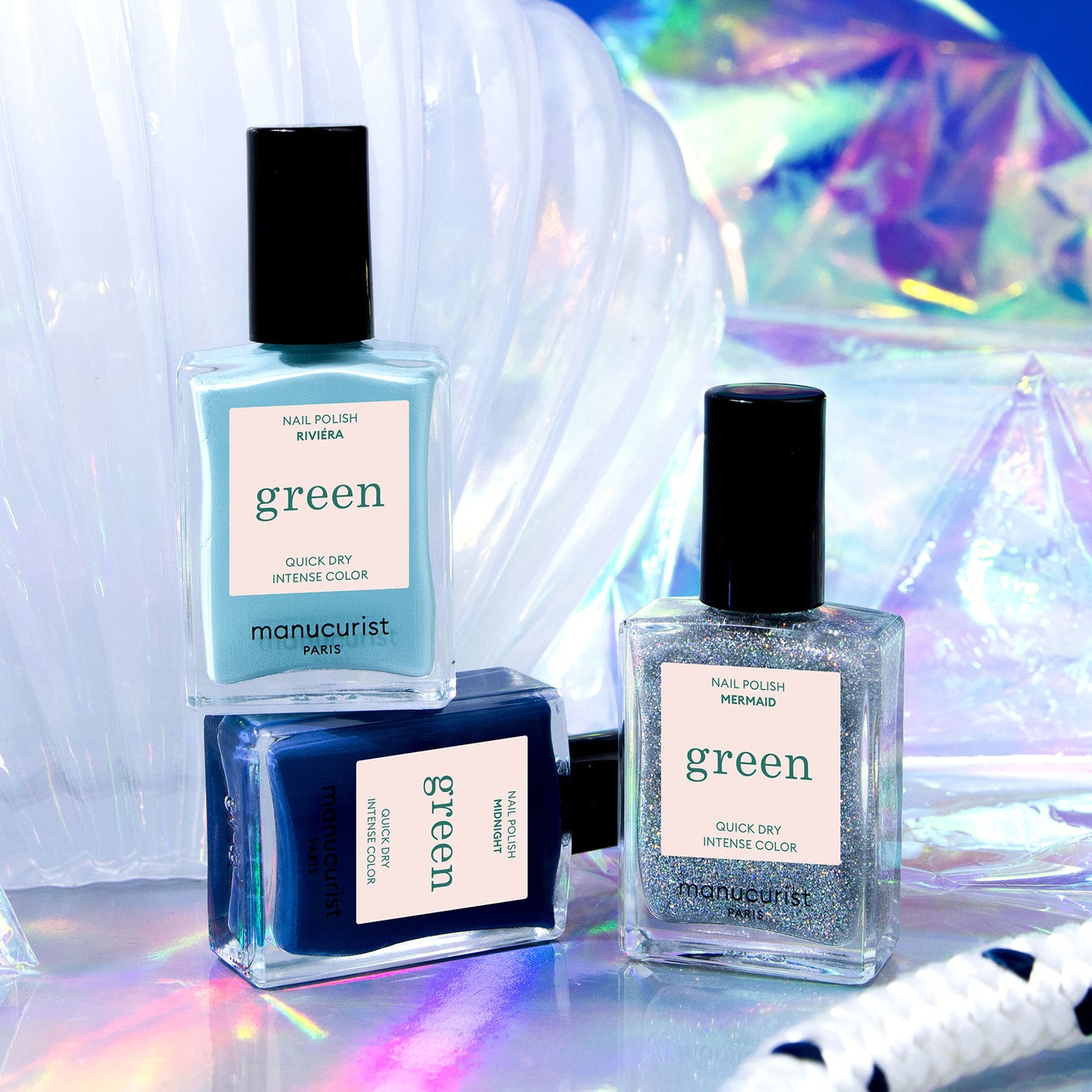 グリーンフラッシュ ネイルラッカー「リヴィエラ」「ミッドナイト」「マーメイド」15mL/¥4,290(税込)