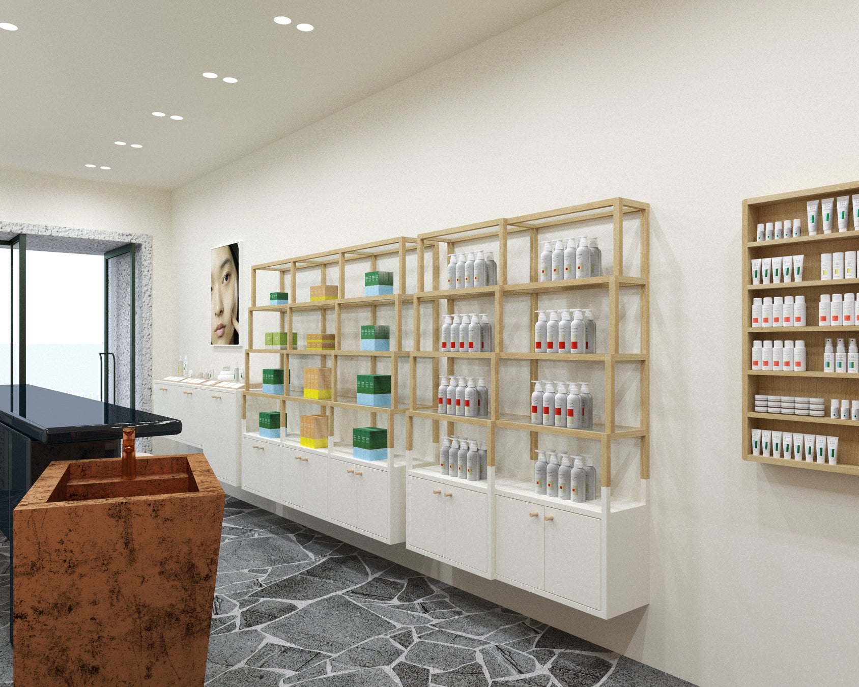 また間伐材と和紙を用いたシェルフや、コッパーを使用したシンク、デザイナー 栗又崇信氏によるトチノキを使用したサイドテーブルは、経年変化とともに洗練された印象の中に柔らかなあたたかみを演出。新たな東京の観光アドレスとしてもご利用いただけるよう、スキンケアプロダクトを通して、見過ごされている日本の魅力をモダンな形で再発見できる空間を目指しました。