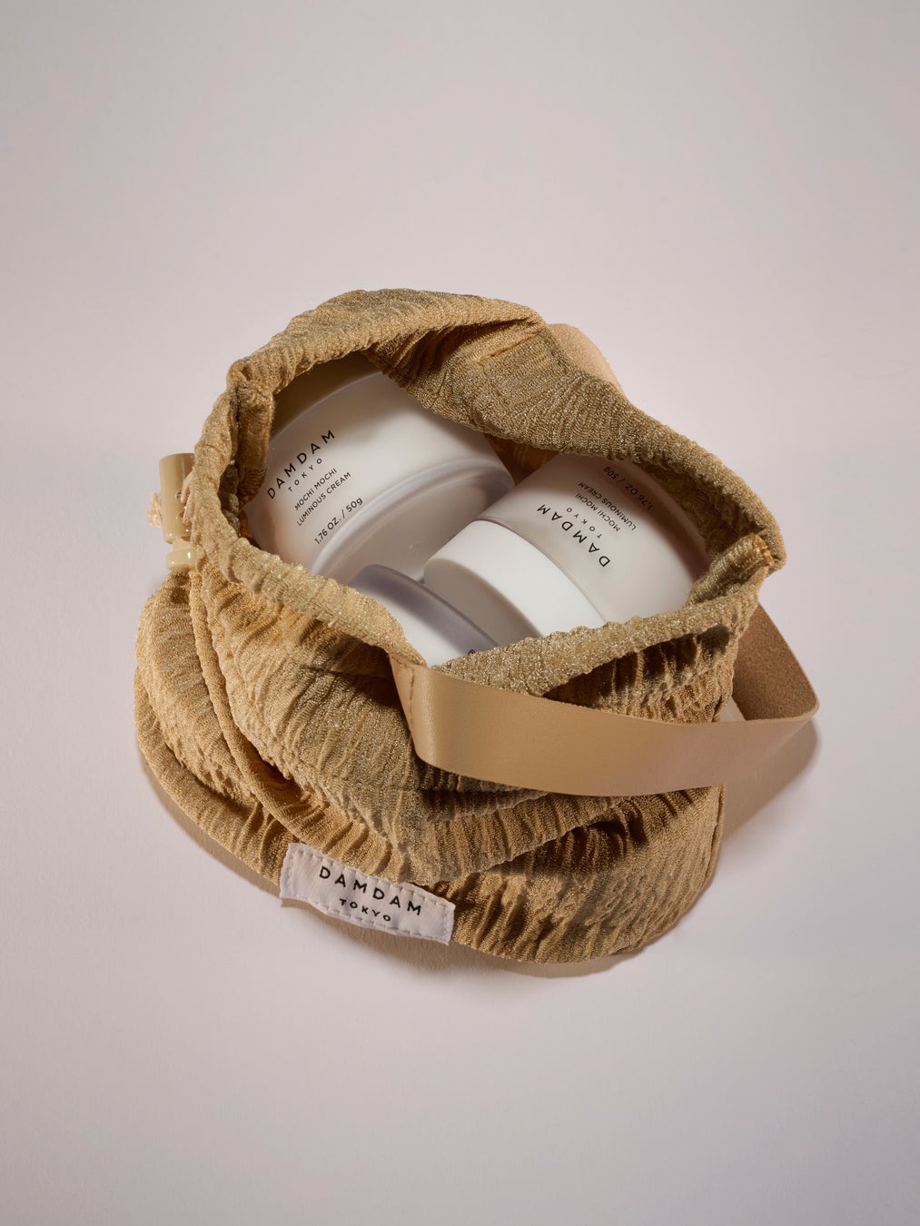 また8月1日(木)からは、税別10,000円以上お買い求めいただいた方に先着で「DAMDAM」のヒーロープロダクト「もちもち ルミナスクリーム」から着想を得たオリジナルポーチをプレゼントいたします。もちもちの手触りで伸びのよい生地で、旅行時のスキンケア収納はもちろん、ワンマイルのお出かけにぴったりです。