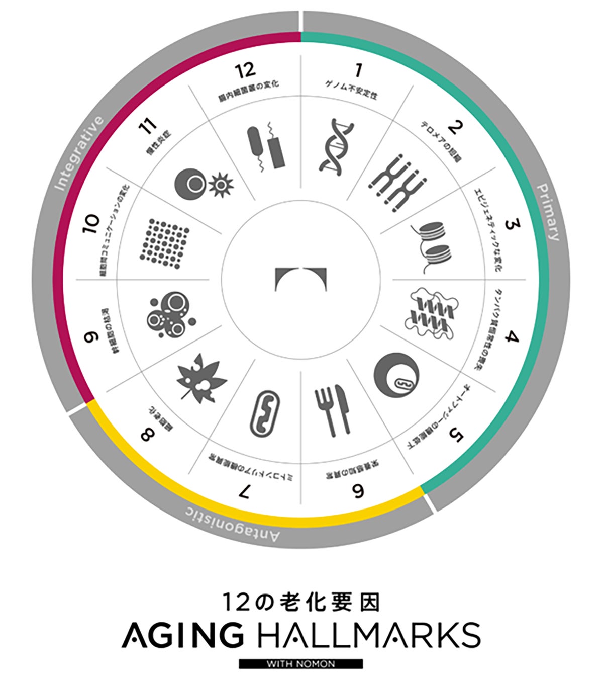NOMONは、「老化制御のトータルソリューション」の提供を目指すために、現代の最先端科学で解明されている12の老化要因『AGING HALLMARKS(エイジングホールマークス)※1』を指標として、研究・開発を進めています。老化プロセスに関与するメカニズムを特定し、将来的には老化の遅延や予防のための介入策を開発することを目指しています。