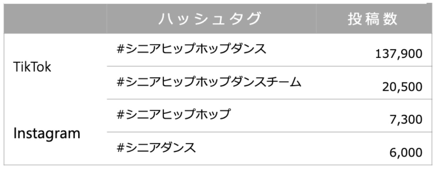 1955年〜1968年に生まれた人は「アクティブ・バブル・シニア世代」と呼ばれ、高度経済成長期やバブル経済時に幼少期から社会人になるまでを過ごし、約半数がディスコを経験しているといわれます。Googleトレンドによると、「シニア ダンス」の検索回数は長期的に上昇しています。TikTokやインスタグラムなどのSNSでも、シニアのダンス関連のハッシュタグと共にダンスの練習風景などの投稿が多くみられます。
