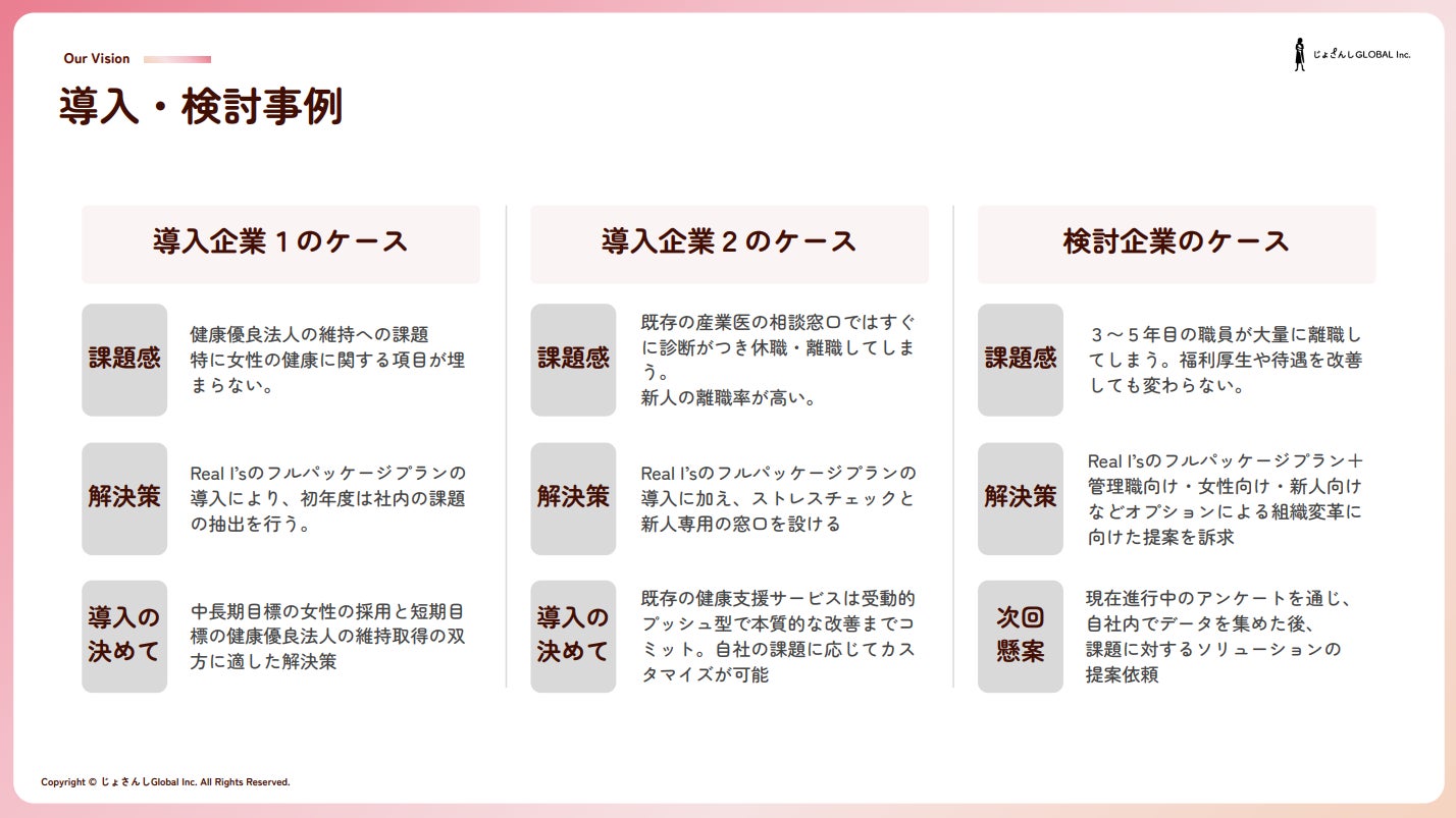 株式会社じょさんしGLOBAL Inc.は、「ココロとカラダを健やかに保ち笑顔で生きることの社会をつくる」をミッションに、健康と幸せを追求する企業です。創業以来、産前産後のオンライン相談サービス「じょさんしONLINE」を提供し、多くの妊産婦をサポートしてきました。「Real I’s」を通じて、企業と従業員が健康で幸福な環境を実現するための新しいスタンダードを提供してまいります。