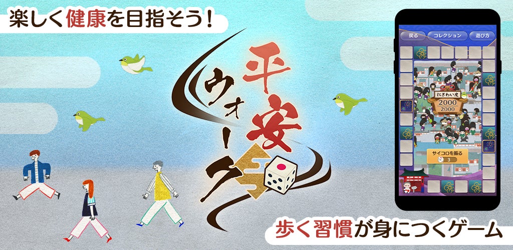 本ゲームは、歩いた歩数に応じてサイコロを入手し、それを使ってゲームの中の平安京を賑わせていくゲームです。特にシニアの方々の歩くきっかけ・楽しみを作り、歩く習慣を身に着けるためのサポートを目的として制作されております。