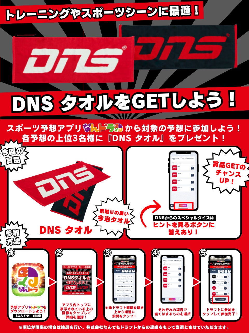 対象期間中に開催されるプロ野球公式戦の勝敗予想と、DNSに関するクイズやアンケートの回答いただき、毎日の予想成績で1位〜3位となった3名様には、肌触りの良い今治タオルで、サイズもトレーニングやスポーツシーンで使いやすいサイズが特徴的な、公式オンラインショップ限定の『DNSタオル』をプレゼントします。