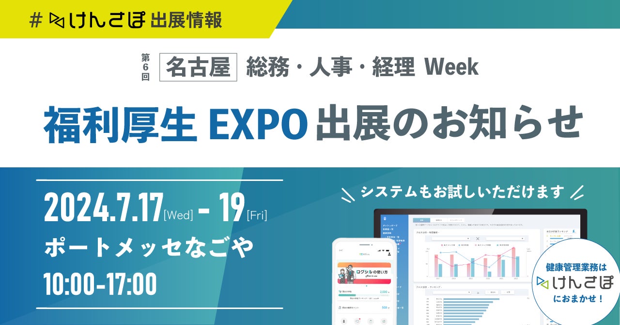 100円から始められる企業向け健康管理サービス「けんさぽ」を中心に、コストパフォーマンスに優れたヘルスケアサービスを開発・提供する株式会社Personal Health Tech(本社:大阪府大阪市、代表取締役:新田哲哉)は、2024年7月17日(水)~19日(金)の3日間、ポートメッセなごやにて開催される『第6回 名古屋 福利厚生EXPO』に出展いたします。