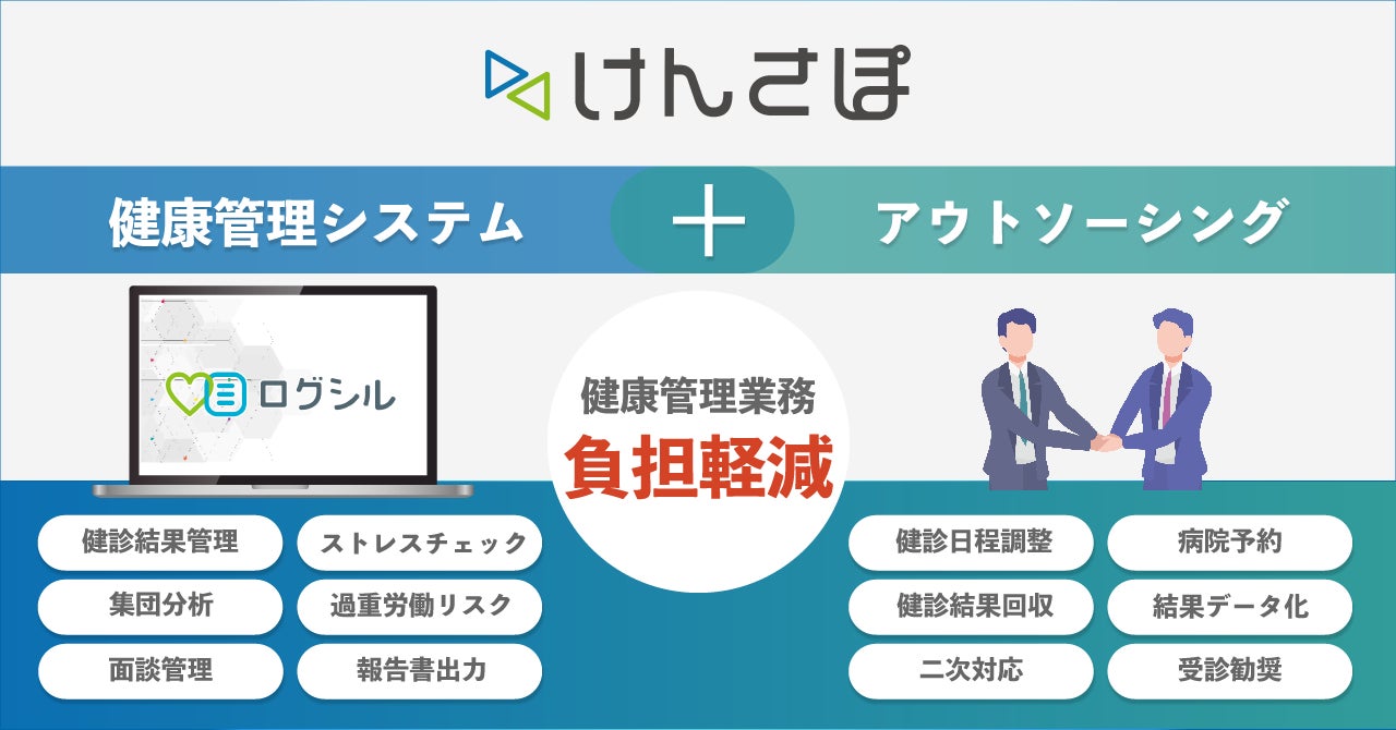 「けんさぽ」は健康管理システム「ログシル」とアナログ作業のアウトソーシングを、業界最安値水準である月額100円/人~で提供することで、企業の健康管理業務の負担を大幅に軽減する企業向け健康管理サービスです。