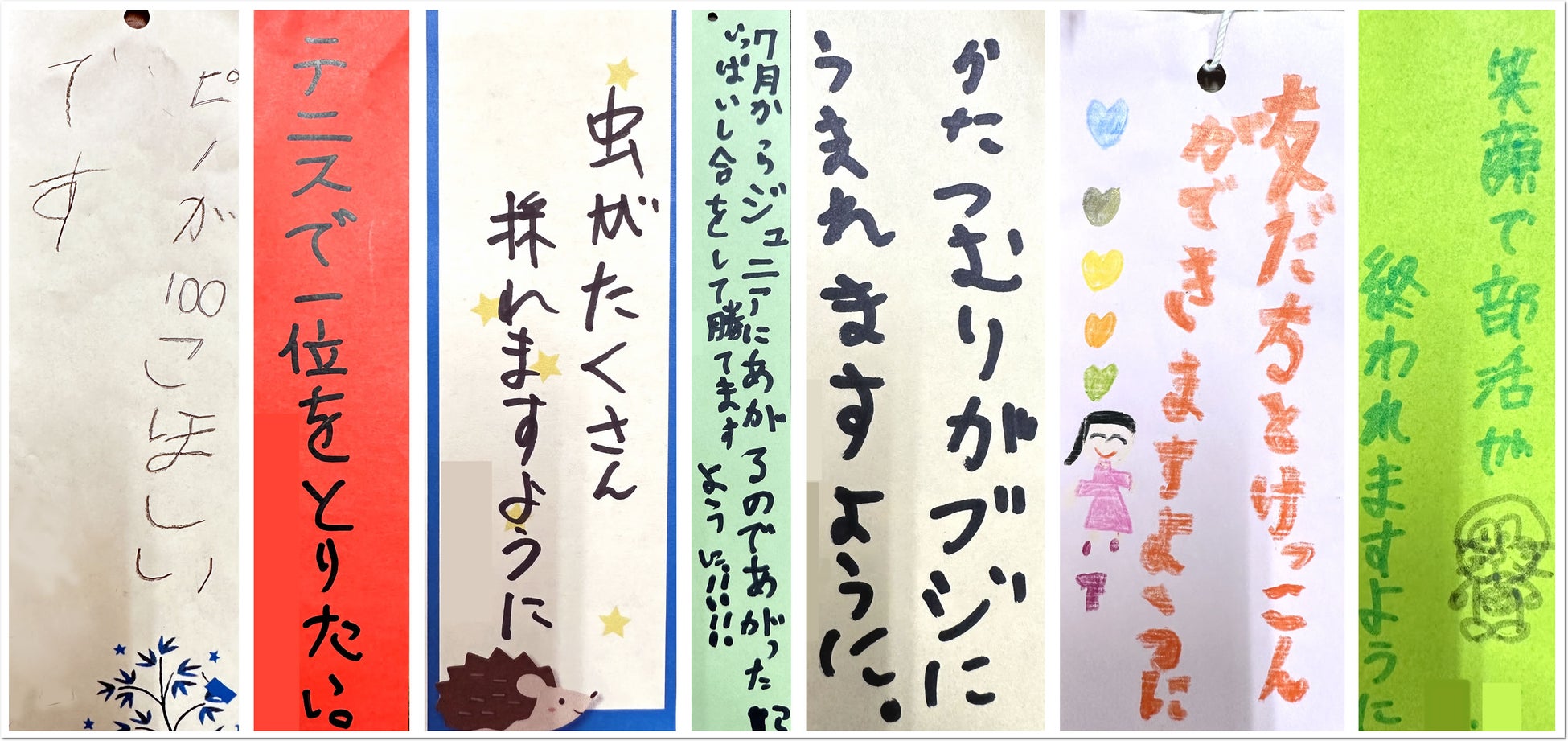 ITCテニススクールでは、毎年七夕の時期に、スクール生のみなさんから願い事を募集して、短冊の飾り付けを行っています。今年もたくさんの願い事が集まりました。