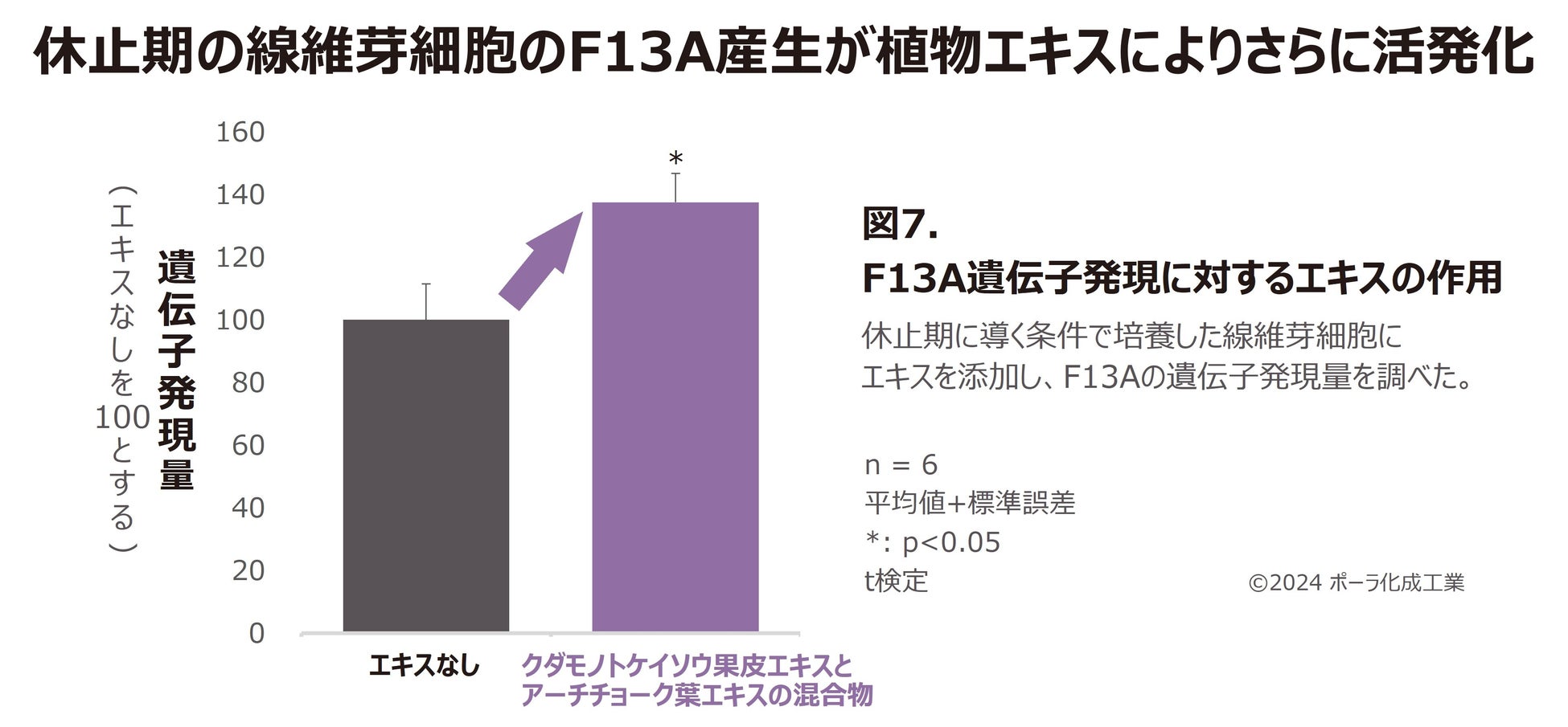 クダモノトケイソウ果皮エキスとアーチチョーク葉エキスの混合物が、休止期のF13A産生をさらに高めることを見出しました(補足資料7)。本研究は、肌のハリ・リフトアップを実現するための新たなメカニズムの理解につながります。