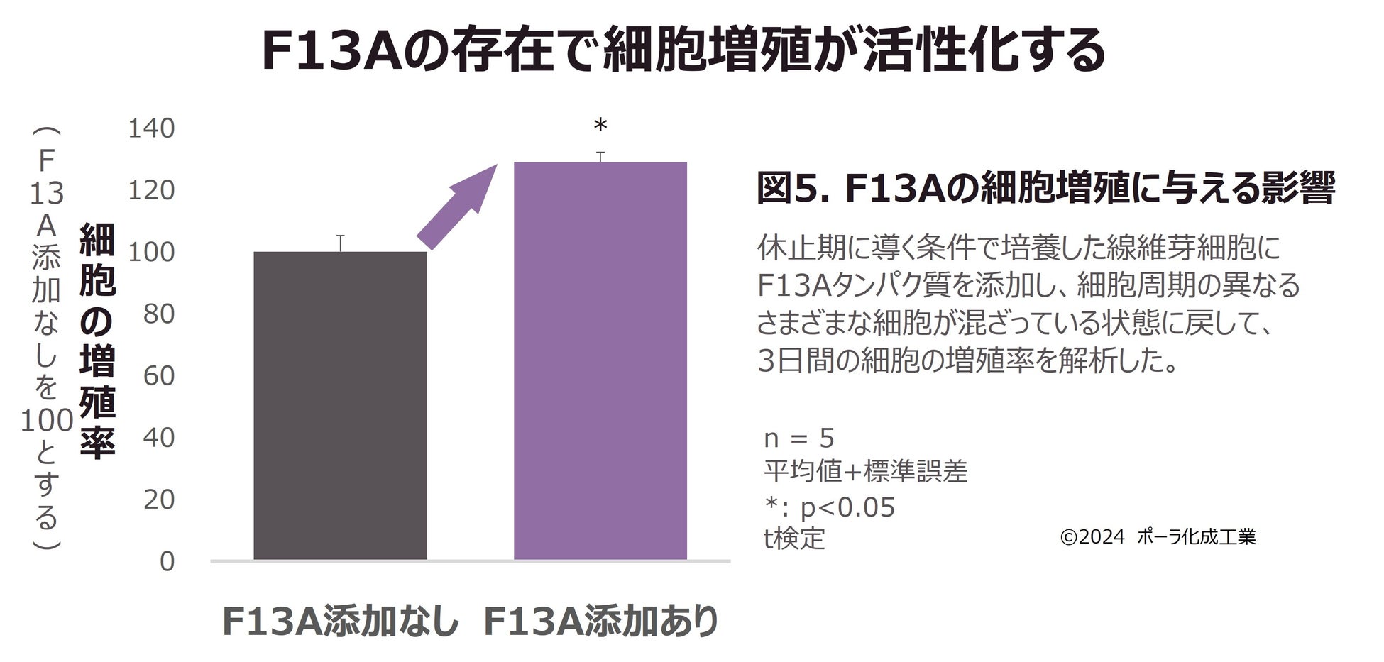 F13Aの細胞の増殖能力に対する影響を調べました。休止期に導く条件で培養した真皮由来の線維芽細胞にF13Aを添加し、細胞周期の異なるさまざまな細胞が混ざっている状態に戻すと、細胞増殖が活性化することが分かりました(図5)。