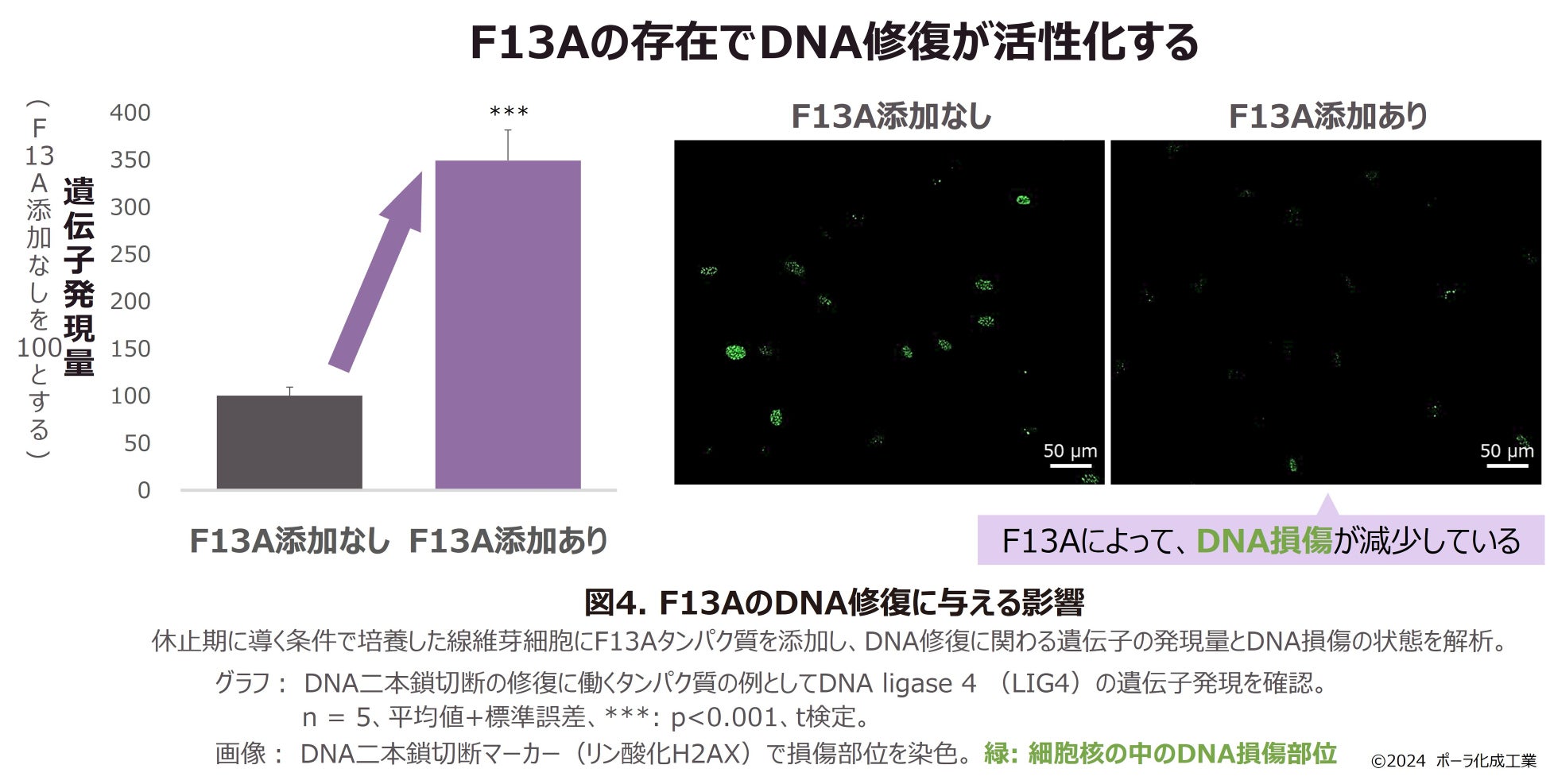 DNA損傷に対するF13Aの影響を調べました。休止期に導く条件で培養した真皮由来の線維芽細胞にF13Aを添加すると、DNA修復に関連する遺伝子が活性化し(図4グラフ)、DNA損傷量が減少しました(図4画像)。これにより、F13AはDNA損傷の修復を活性化することが示されました。
