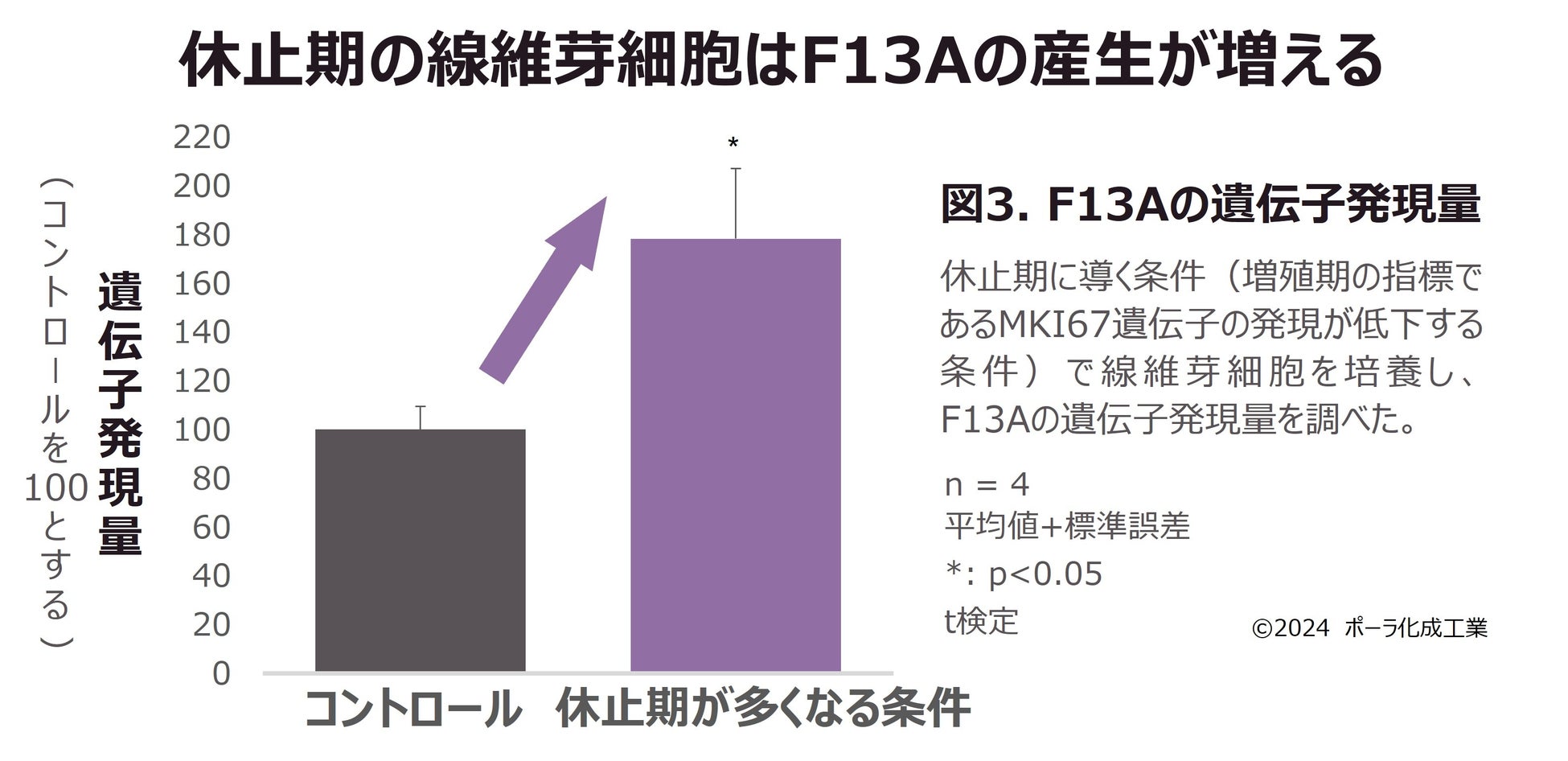 ポーラ化成工業でこれまで進めてきた線維芽細胞の研究の中で、休止期ではF13Aの発現が増加することが分かったことから、F13Aに着目して研究を進めることとしました。