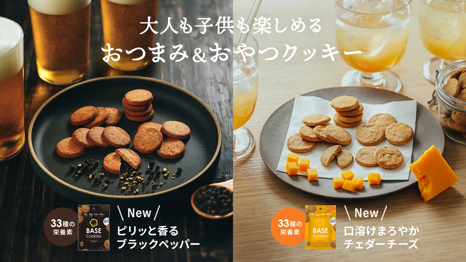 取締役:橋本舜、https://basefood.co.jp)は、1食に必要な33種類の栄養素がすべてとれる全粒粉ベースの完全栄養クッキー※4「BASE Cookies(ベースクッキー)」シリーズから、大人も子どもも楽しめる完全栄養のおつまみ&おやつクッキーとして、ブラックペッパーがピリッと香る「BASE Cookies ペッパー」とチェダーチーズのまろやかな風味「BASE Cookies チーズ」の2つのフレーバーを、2024年7月24日(水)よりベースフード公式HPオンラインショップ(https://shop.basefood.co.jp/)、他ECサイト、取扱販売店にて順次新発売します。