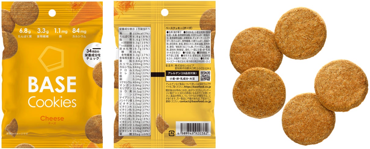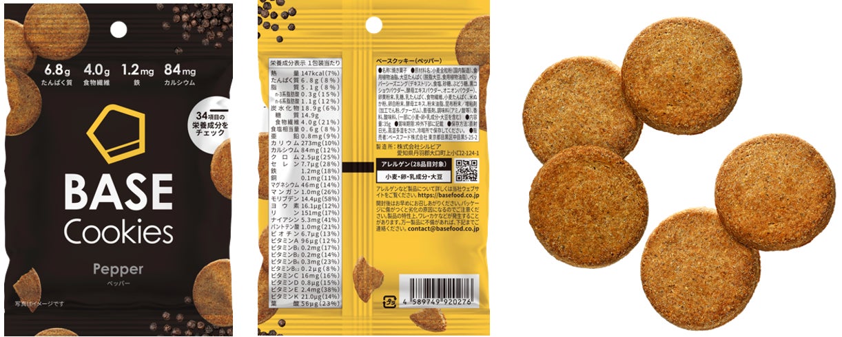 全粒粉ベースのスマートフード完全栄養食「BASE FOOD」ブラックペッパーがピリッと香る「BASE Cookies ペッパー」チェダーチーズのまろやかな風味「BASE Cookies チーズ」