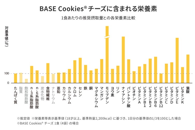 *1 主食(パン類、パスタ、クッキー)において、1食(BASE BREADは2袋、BASE PASTAは1袋、BASE Cookiesは4袋、BASE FOOD Deliは1袋)あたり2を満たし、栄養成分表示に表記している商品(2022年5月Mintel社データベースを使用した当社調べ)
