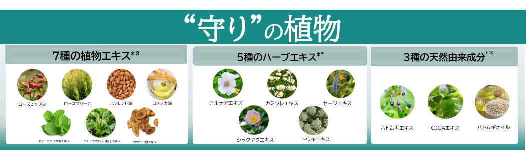 *1メラニンの生成を抑え、しみ・そばかすを防ぐ *2超微細ラメラエマルション技術で処理したパルミチン酸レチノール(油脂成分)*3ハリを与えることで弾力のある肌に見える印象 *4超微細ラメラエマルション技術製法による *5角質層まで *6当社内における独自原料 *7年齢に応じたケア *8ローズヒップ油、ローズマリー油、アルモンド油、オレイン酸フィトステリル(油脂成分)、セイヨウハッカエキス、セイヨウオオバコ種子エキス、オウゴンエキス(保湿成分) *9アルテアエキス、ローマカミツレエキス、セージエキス、シャクヤクエキス、トウキエキス(1)(保湿成分)*10ヨクイニンエキス、ツボクサエキス(保湿成分)、ハトムギ油(油脂成分)*11全ての方に皮膚刺激が起こらないということではありません *12無香料、合成着色料フリー、無鉱物油、パラベンフリー、アルコールフリー、石油系界面活性剤フリー、シリコンフリー、タルクフリー *13うるおいを与えて、乾燥により目立った毛穴を目立たなくすること *14超微細ラメラエマルション技術で処理した3-O-エチルアスコルビン酸(保湿成分)