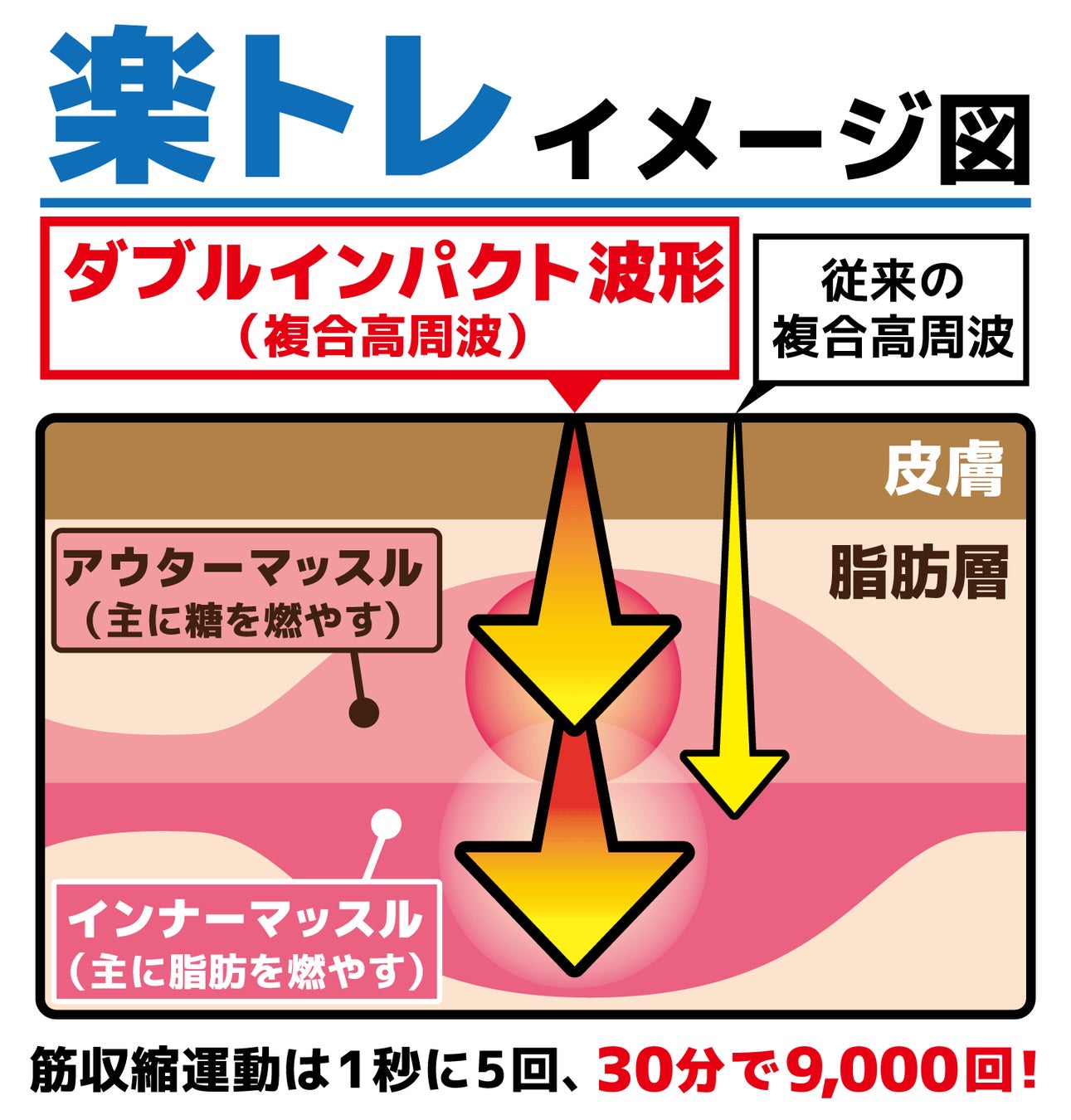 EMS(Electrical Muscle Simulation)と呼ばれる「電気治療器」を使い、「複合高周波」と呼ばれる特殊な電気が15cm以上の深さまで通電し、腹部などのインナーマッスルを鍛える事ができます。