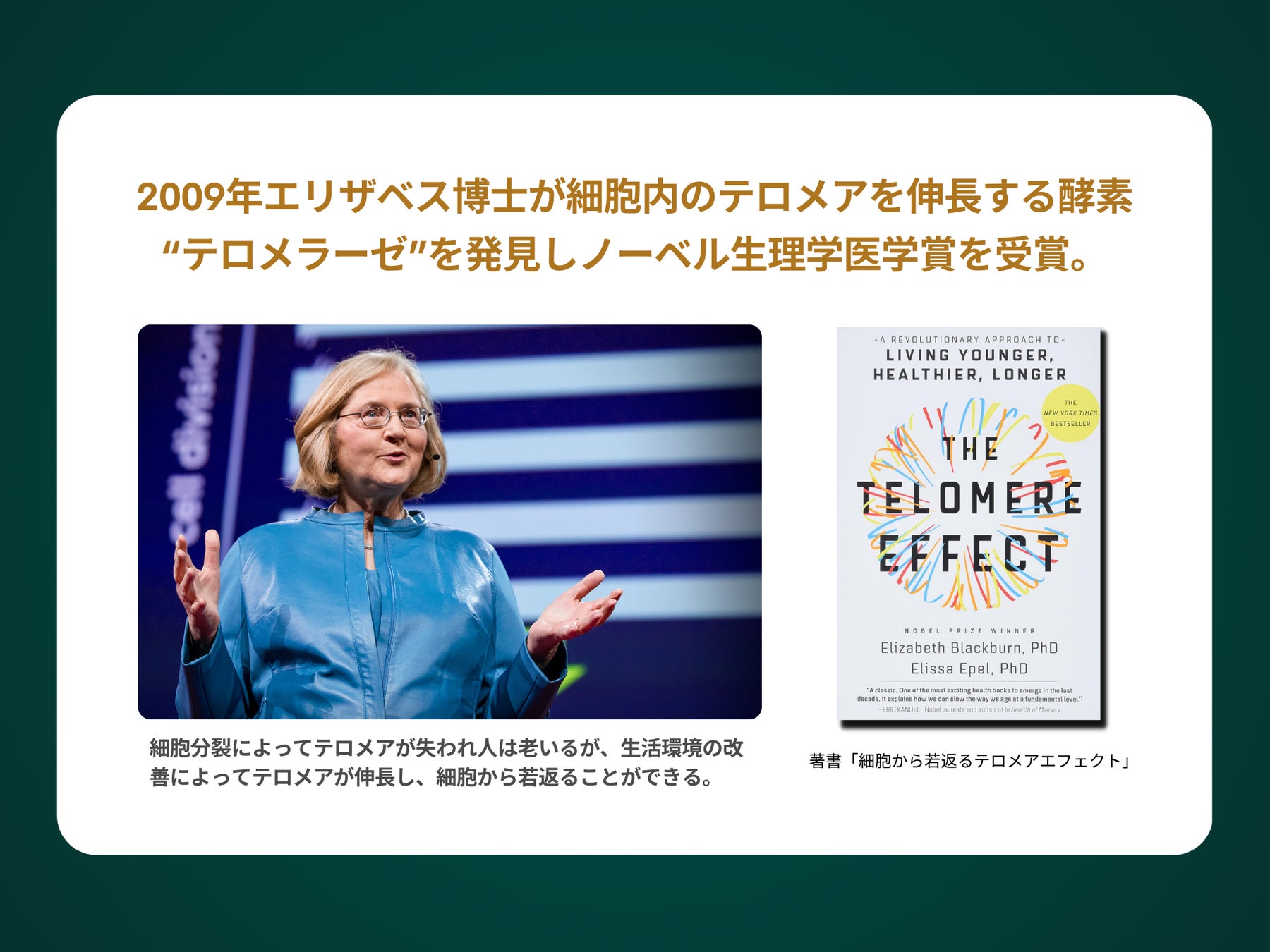 2009年にノーベル生理学医学賞を受賞したエリザベス博士の研究により発見された細胞を若返らえせる酵素「テロメラーゼ」の分泌により、人の細胞が若返ることが証明されました。