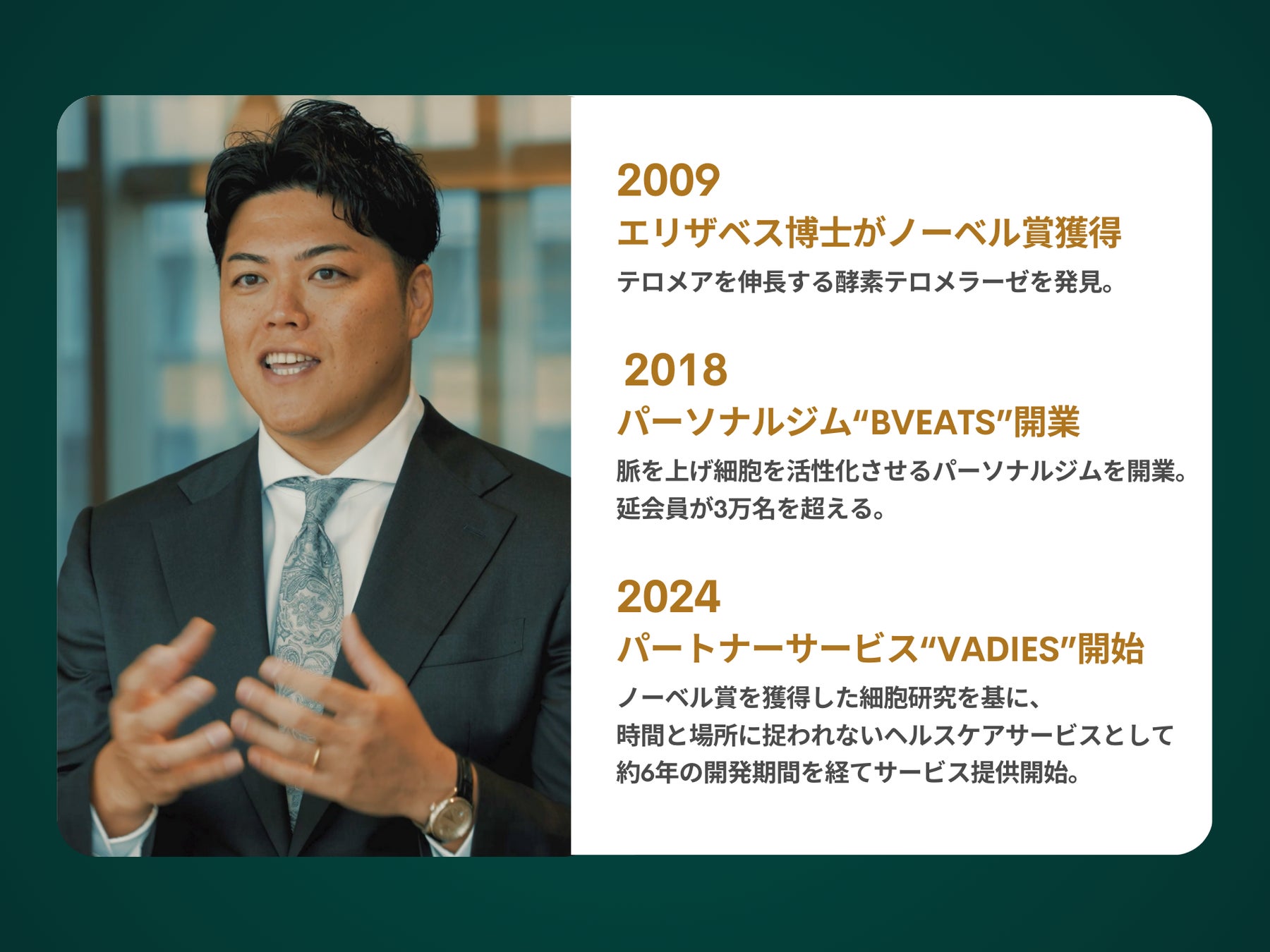 2009年にノーベル賞を獲得した細胞研究を元に約6年の歳月をかけ開発したVADIES(バディーズ)は、専属の秘書がついて、毎日の運動、食事、睡眠、水分、温活、柔軟といった生活習慣をデバイス管理するだけでなく、毎日の秘書との小さな約束を達成することで無意識にダイエットが実現するパートナーサービスです。