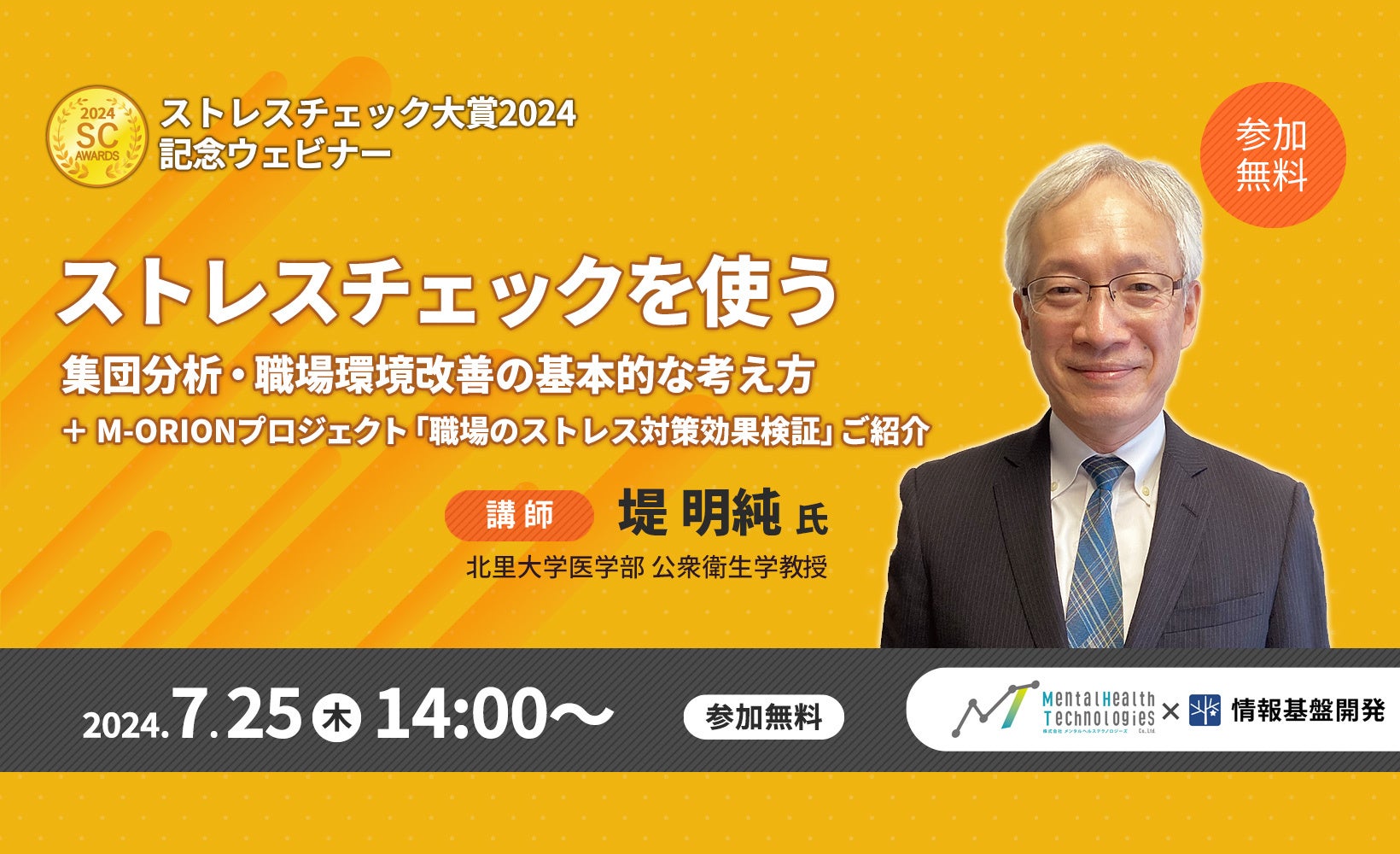 法人向けストレスチェックサービス等を提供する東大発ヘルステック企業の弊社・株式会社情報基盤開発(本社:東京都文京区、代表取締役:鎌田長明、以下情報基盤開発)は7月25日、従業員の心身の健康管理に関するサービスを提供する株式会社メンタルヘルステクノロジーズとの共催で、北里大学医学部教授・堤明純氏が登壇する「ストレスチェック大賞2024」記念ウェビナー第3弾のライブ配信を行います。参加無料。