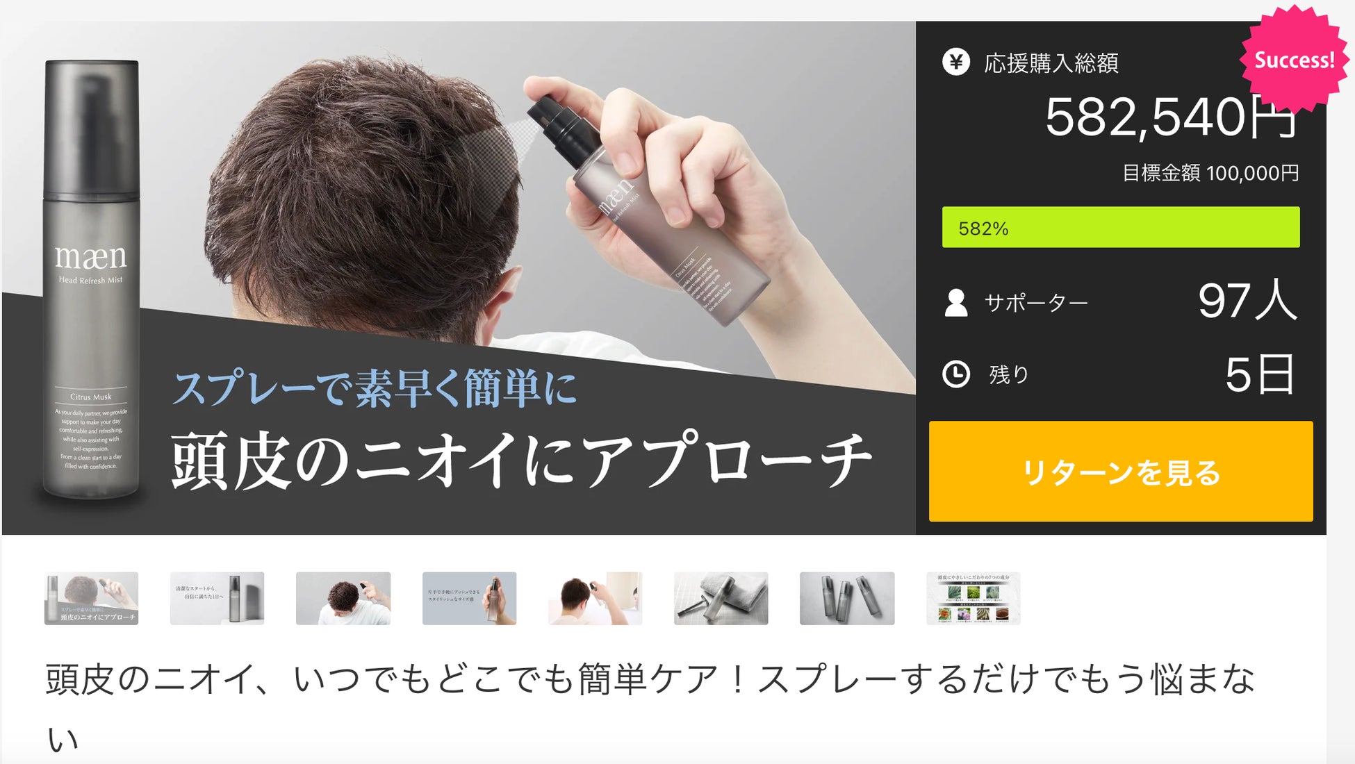 目標金額の582%を達成中!頭皮のニオイ、いつでもどこでも簡単ケア。スタイリッシュなデザインと持ち運びやすさを両立し、あらゆるシーンで活躍。
