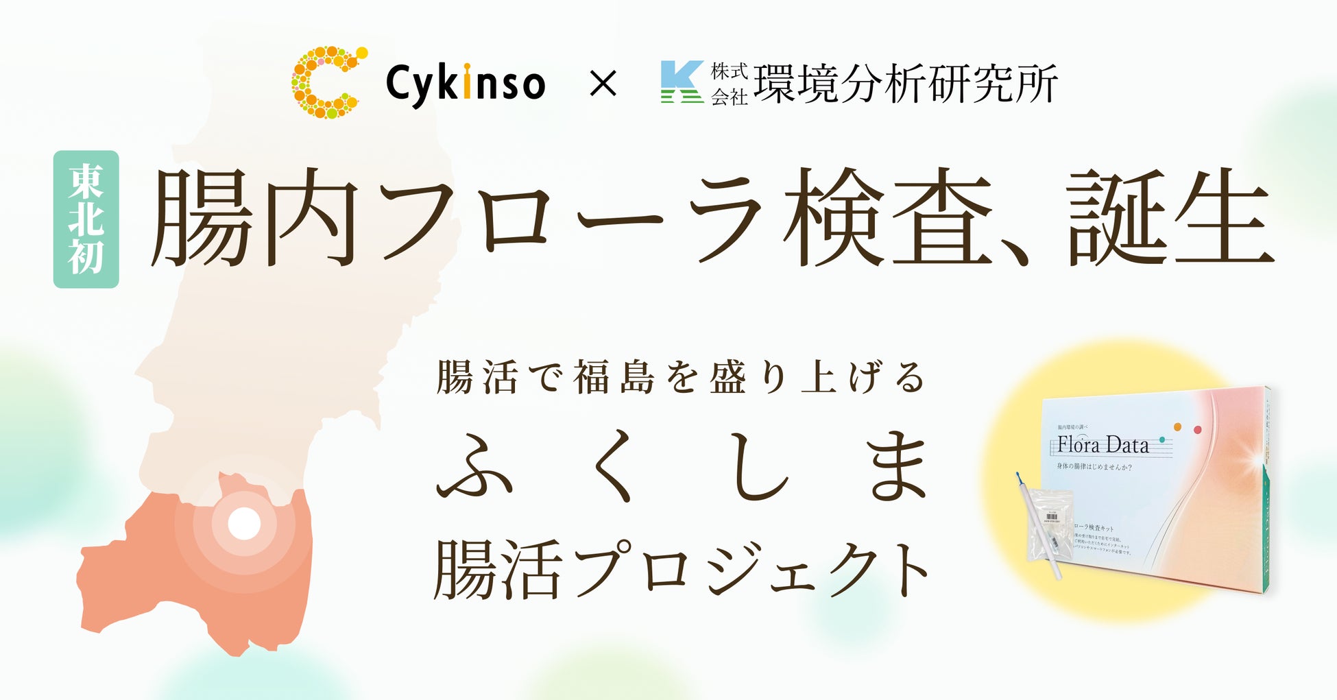 腸内フローラ検査「マイキンソー(Mykinso)」を開発・提供する株式会社サイキンソー(本社:東京都渋谷区、代表取締役:沢井 悠、以下サイキンソー)は、福島県で理化学検査や臨床検査を手掛ける株式会社環境分析研究所(本社:福島県福島市、代表取締役社長:菊池 美保子、以下環境分析研究所)と共同で、東北初※1となる腸内フローラ検査「Flora Data」(販売元:環境分析研究所)の販売を開始したことをお知らせいたします。「Flora Data」の発売を皮切りに、腸活を通じて、健康課題が深刻な福島県民の皆さまの健康増進と地域の産業振興を応援する「ふくしま腸活プロジェクト」を発足いたします。
