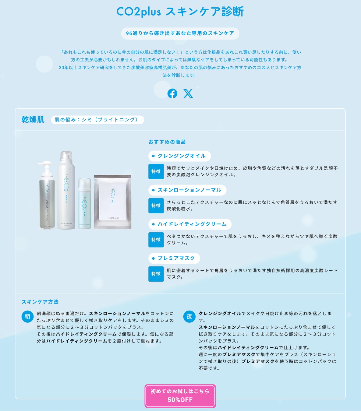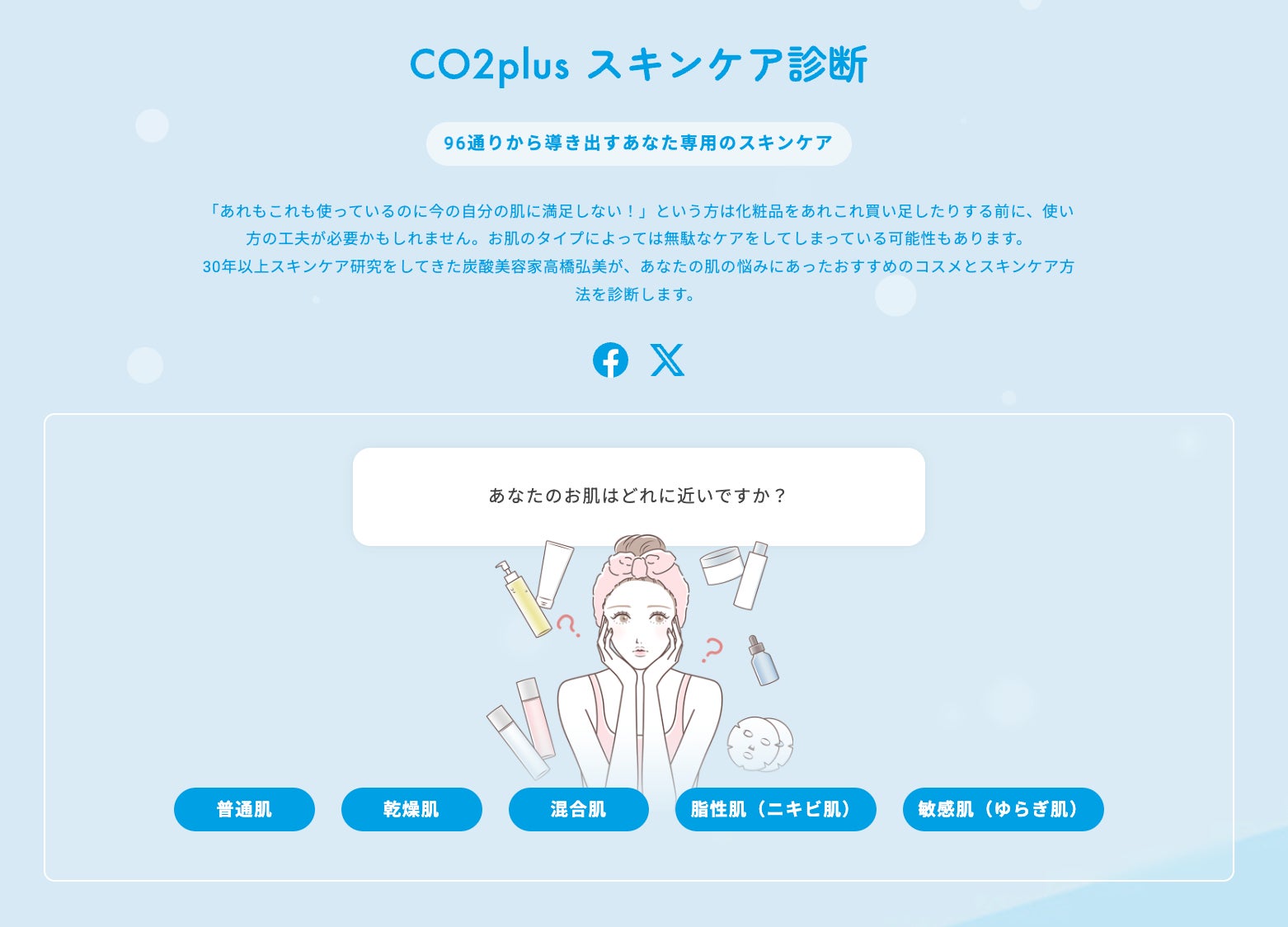 シーオーツープラス株式会社(本社:広島県山県郡北広島町、代表取締役:炭酸美容家髙橋弘美)は、お客様が自分の肌と肌悩みに沿った炭酸スキンケア(fromCO2)からたった3ステップでおすすめの化粧品がわかるスキンケア診断を2024年7月25日にリリースします。
