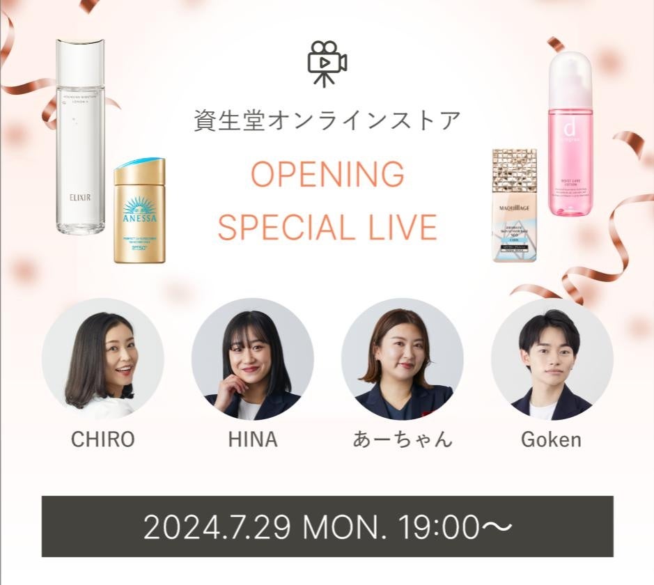 7月29日(月)19:00~22:00配信*。資生堂パーソナルビューティーパートナーが、オープン記念オンラインストア限定特別キットの推しポイントをご紹介。
