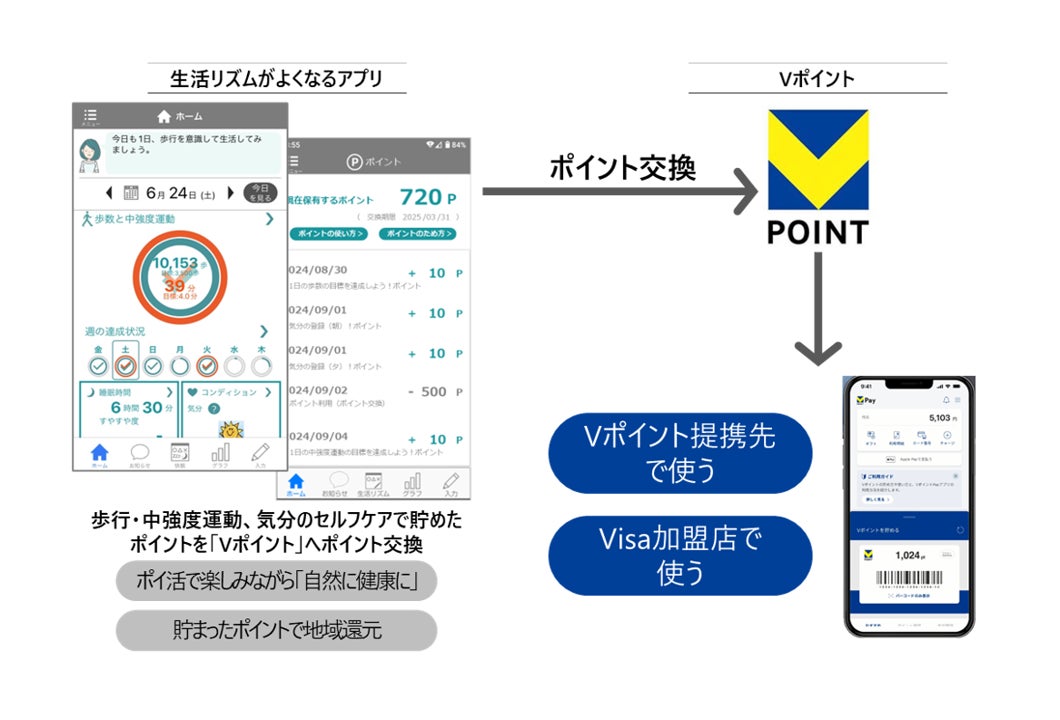 株式会社日立システムズ(本社:東京都品川区、代表取締役社長:柴原 節男、以下「日立システムズ」)、CCCMKホールディングス株式会社(本社:東京都渋谷区、代表取締役社長 兼 CEO:高橋 誉則、以下「CCCMKHD」)、三井住友カード株式会社(本社:東京都江東区、代表取締役社長:大西 幸彦、以下「三井住友カード」)は、2024 年8月30 日(金)より、日立システムズが提供する健康支援サービス「生活リズムがよくなるアプリ」で貯めたポイントのVポイントへの交換を開始いたします。
