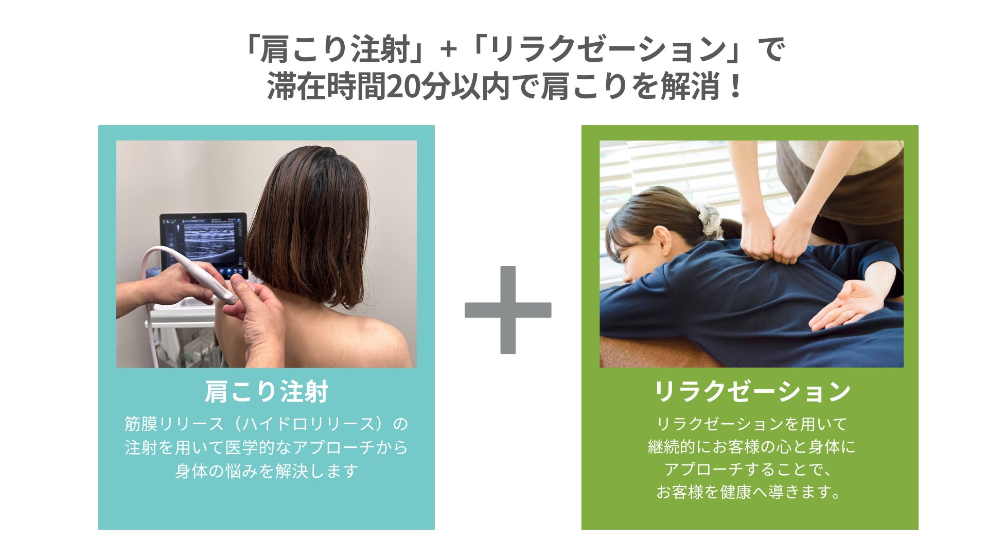 東京肩こりクリニックでは、「肩こり注射」と「ボディケア」で根本的な肩こりのお悩みを解消していきます。Re.Ra.Kuグループが培ってきた経験と医師で肩こり解消についてここ数年議論を重ねてまいりました。肩こりの原因に直接アプローチできる解剖機能学に基づいた独自のメソッドによる「ハイドロリリース注射」により痛みの原因を取り去ります。その後、Re.Ra.Ku の肩甲骨ストレッチを約5分行うことにより、筋膜リリース(ハイドロリリース)でほぐれた肩まわりの柔軟性を更に高め関節の可動域を広げることで、治療の効果をさらに増大させ、肩こりを解消していきます。