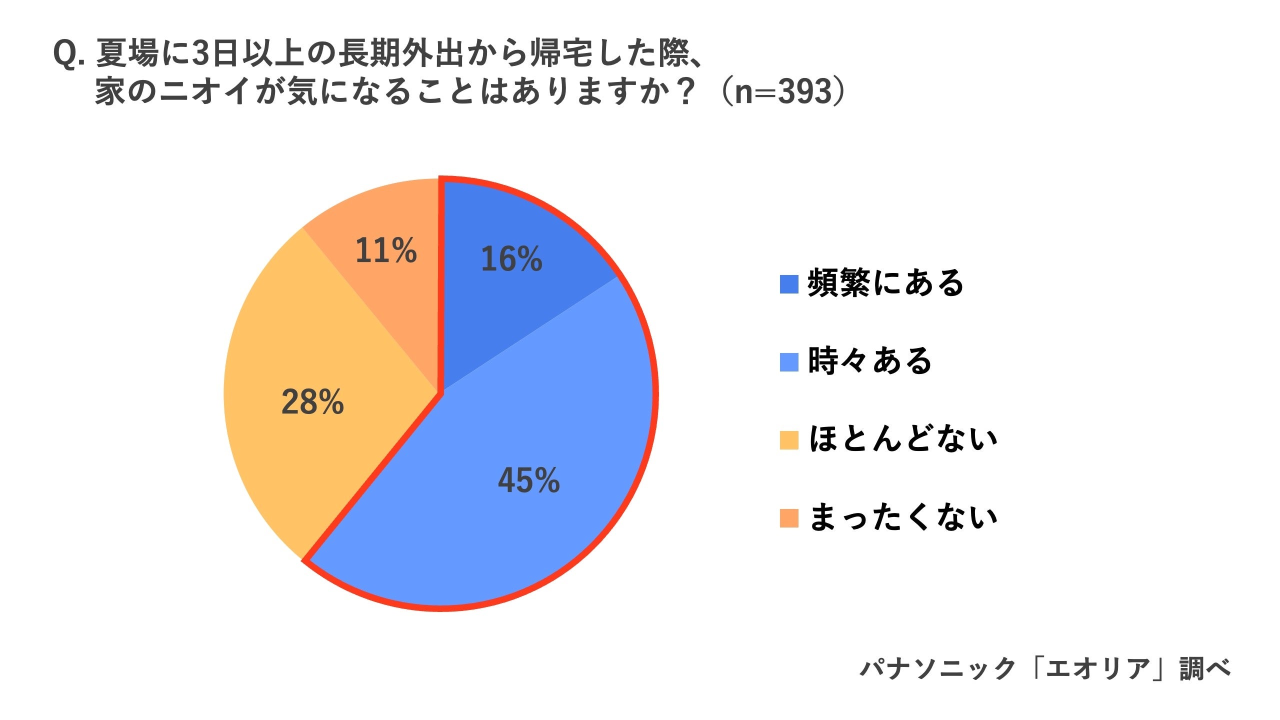 部屋を換気せずに密閉した状態がさらに続く長期外出の場合は、「頻繁にある」(16%)、「時々ある」(45%)と、61%が「ある」と回答しています。