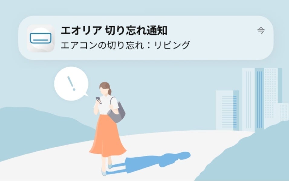 「エオリア アプリ」を使えば、外出先からスマホで運転オフできます。さらに、外出時にエアコンを切り忘れていたら「切り忘れ通知」をお知らせします。