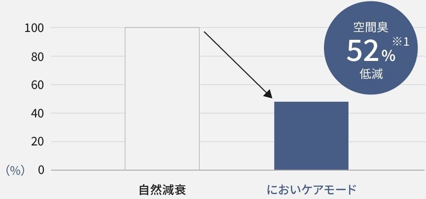 ※1:【試験機関】パナソニック ホールディングス(株)プロダクト解析センター【試験方法】JIS B 9917参照。当社試験室(約14畳)において、ニオイ成分(酢酸)を散布、インピンジャー法により室内大気をサンプリングし、ICにて分析。自然減衰したものと、温度30℃、湿度75%から「においケア」除湿モード運転をした後の、室内空間中の酢酸濃度を定量化し、比較 【対象】酢酸 【試験結果】自然減衰から52%の濃度低減を確認(M20SK022)。