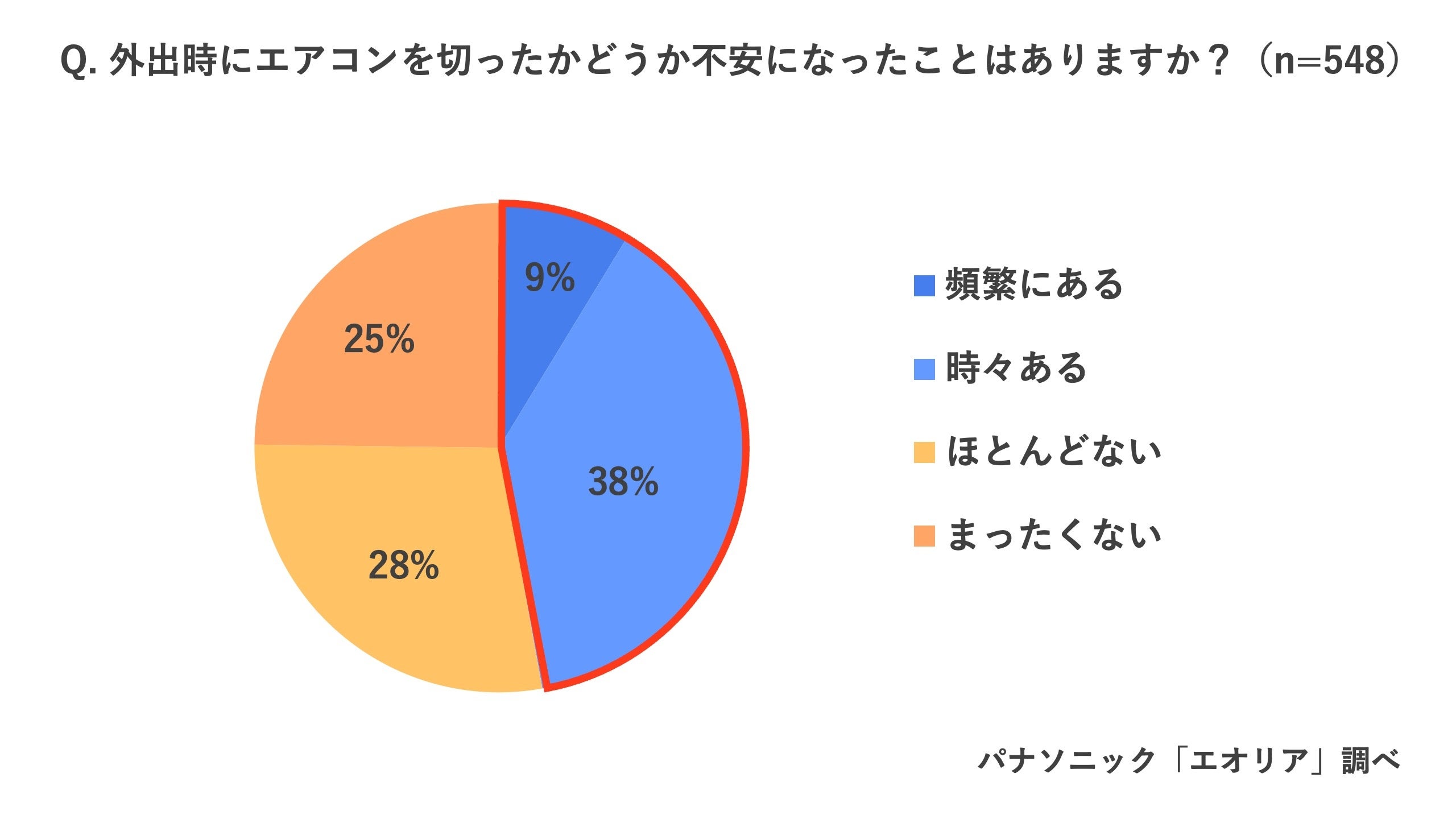 また、外出時に気になるのがエアコンの切り忘れ。「外出時にエアコンを切ったかどうか、不安になったことはありますか?」という質問では、「頻繁にある」(9%)、「時々ある」(38%)と47%が「ある」と回答しました。