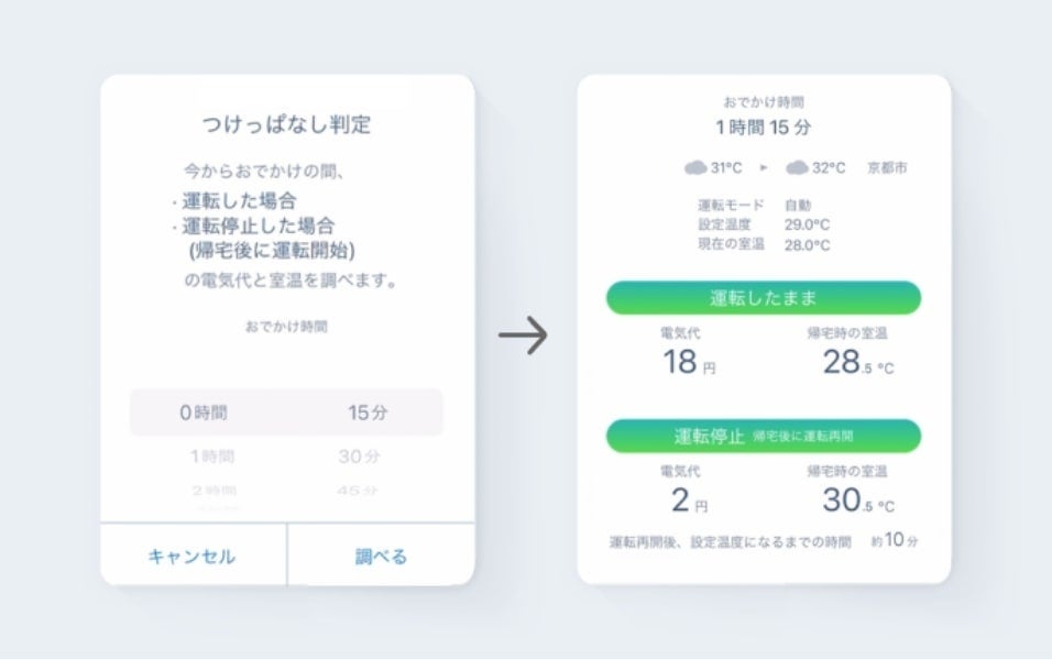 また、外出時にエアコンをつけっぱなし運転するか迷ったときに便利な「つけっぱなし判定」も可能です。