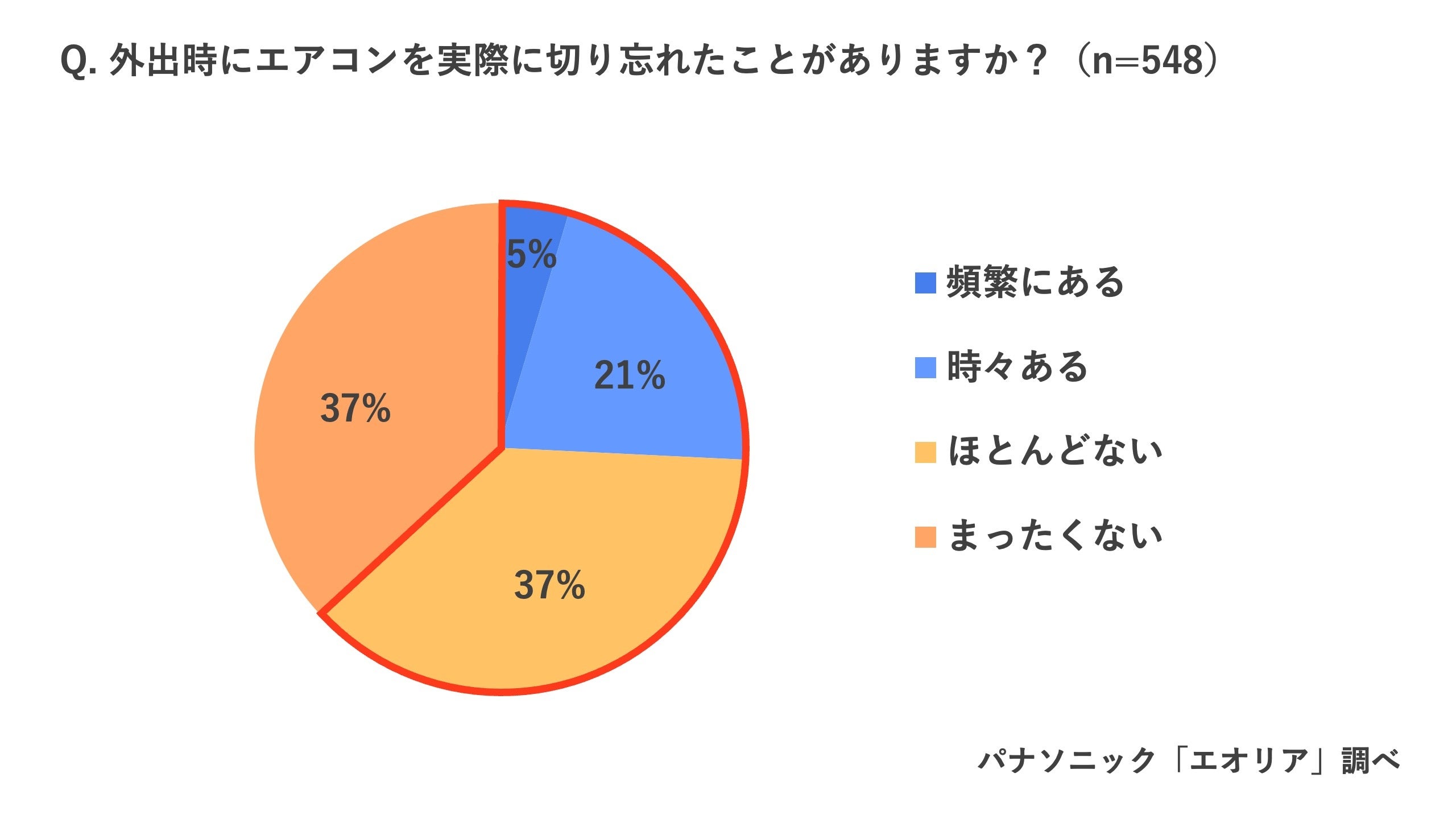 さらに、実際に切り忘れた経験については、「頻繁にある」(5%)、「時々ある」(21%)と26%が「ある」と回答しており、「ほとんどない」(37%)を含めると63%がエアコンを切り忘れた経験があることがわかりました。